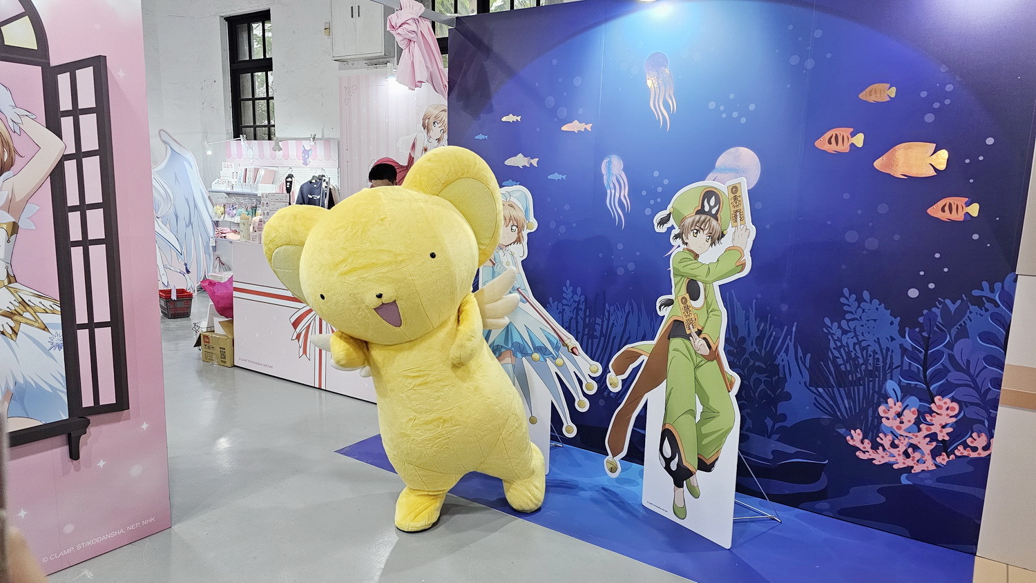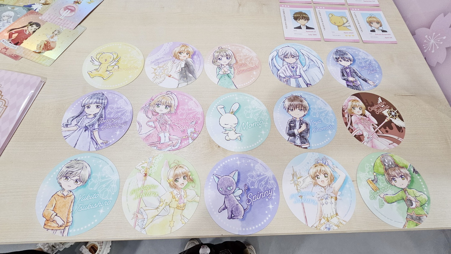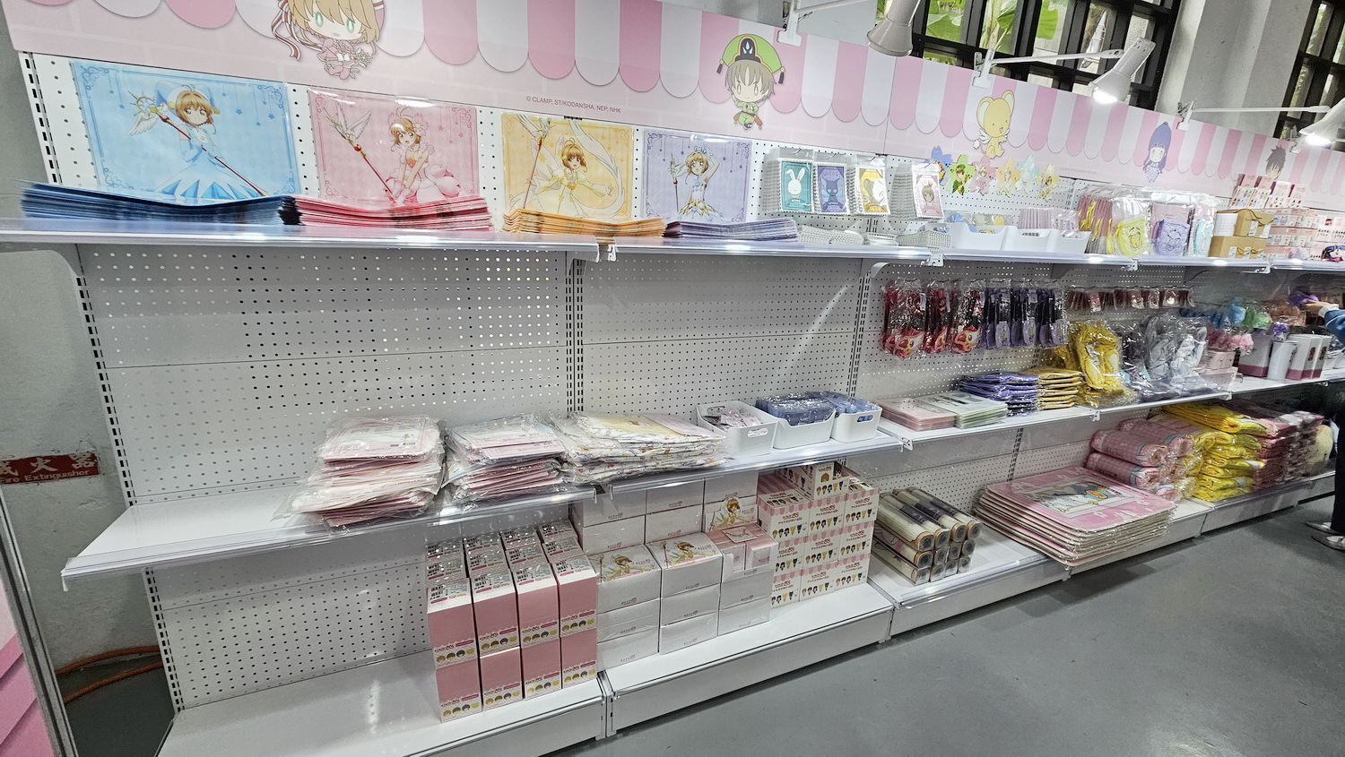 周邊部分也推出多款限定商品,包含愛心造型盲抽徽章(10 款)、可轉動的摩天輪造型壓克力立牌、小可卡套、A4 橫式資料夾(4 款配色,搭配小櫻不同戰鬥服)、銀箔材質郵票造型明信片,以及透紗刺繡 T 恤、短版 T 恤與多款摺疊購物袋。凡於快閃店內消費滿 999 元,即可以 129元 加價購青蛙裝小可造型大紙袋。