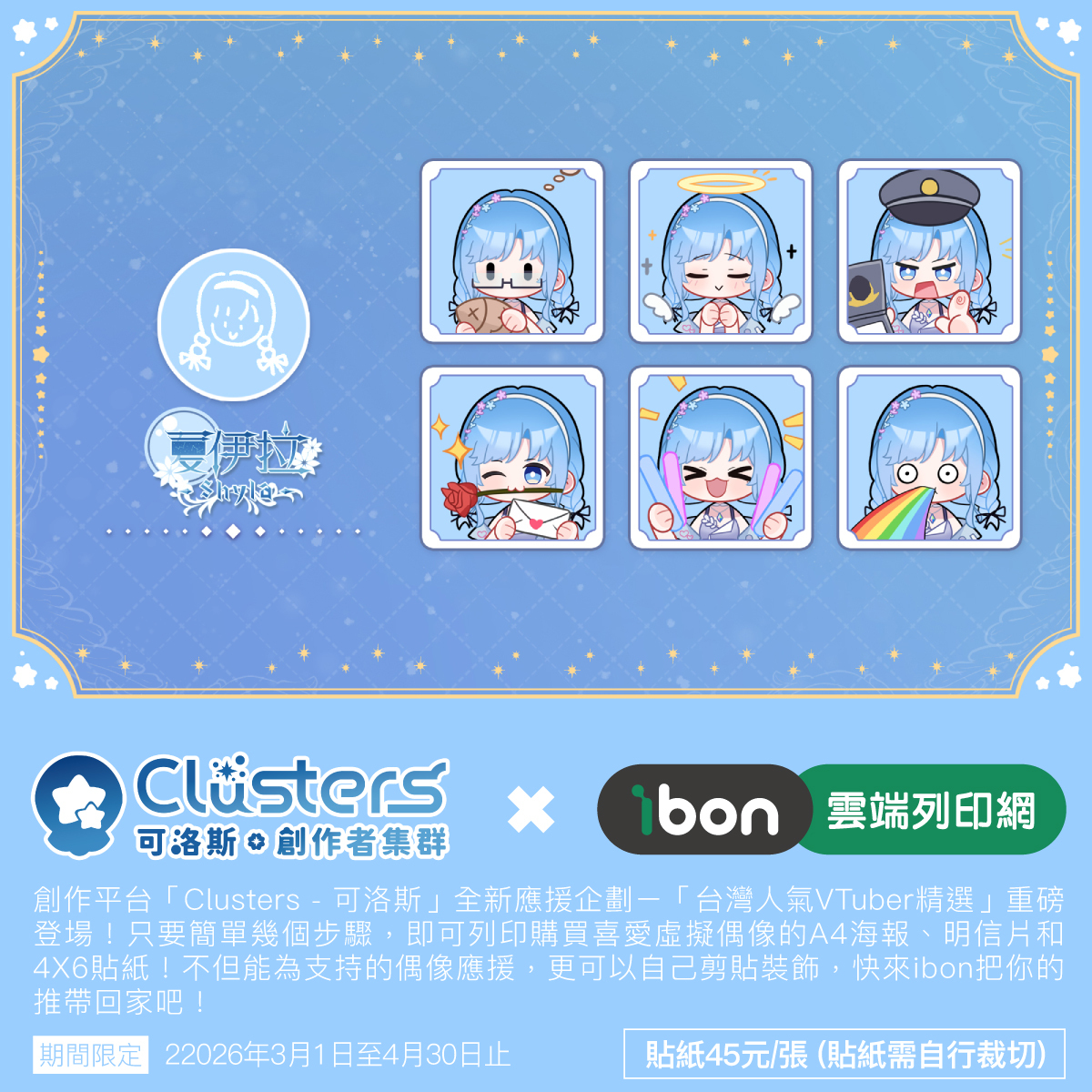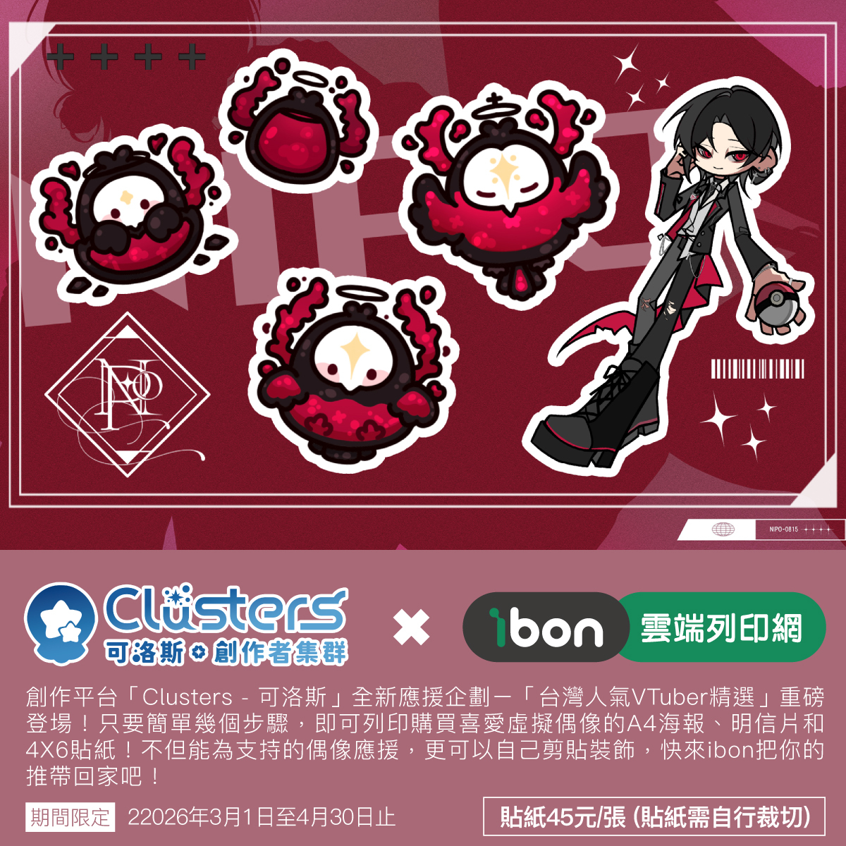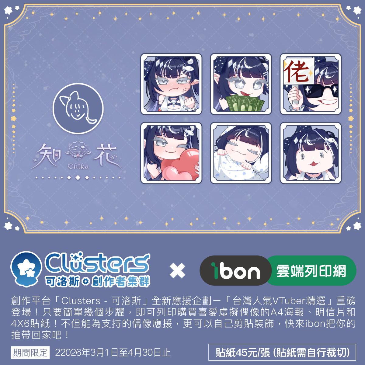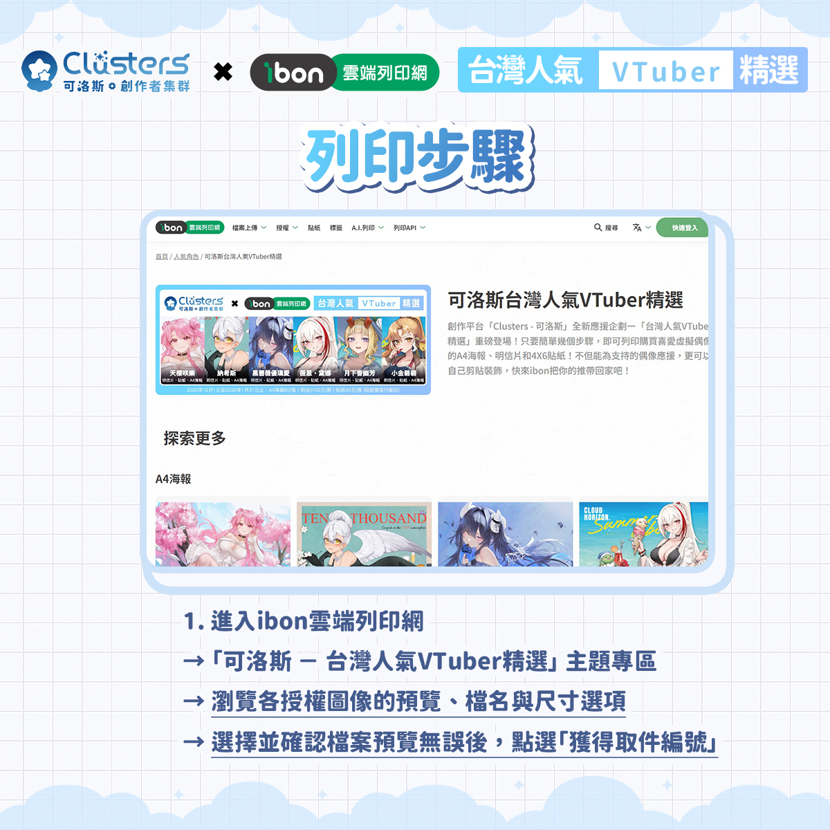 本企劃為台灣創作平台「Clusters-可洛斯.創作者集群」與「ibon 雲端列印網」,再度攜手推出的第四彈創作者應援企劃。粉絲只要前往全台設有 ibon 機台的便利商店,輸入取件編號或掃描 QR Code,便能購買喜愛 VTuber 的 A4 海報、4×6 明信片與 4×6 貼紙。 本企劃的銷售金額將有一部分直接回饋創作者,用行動支持大家的持續創作。