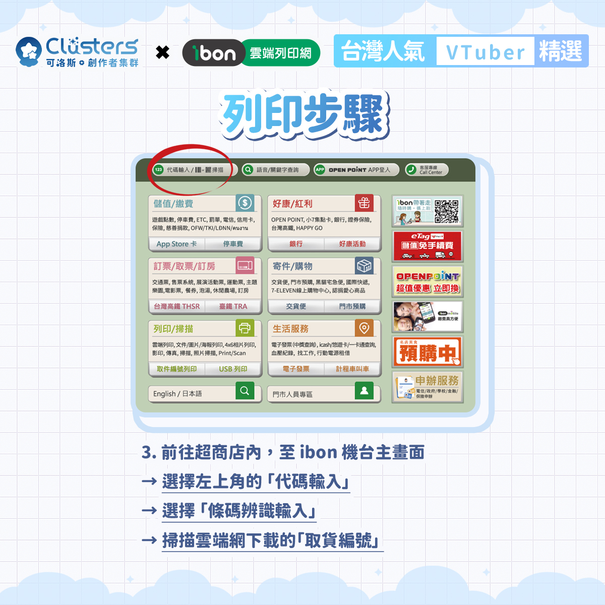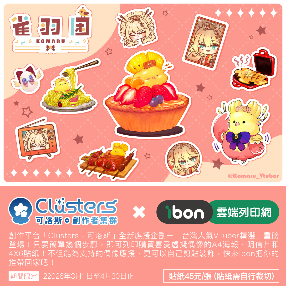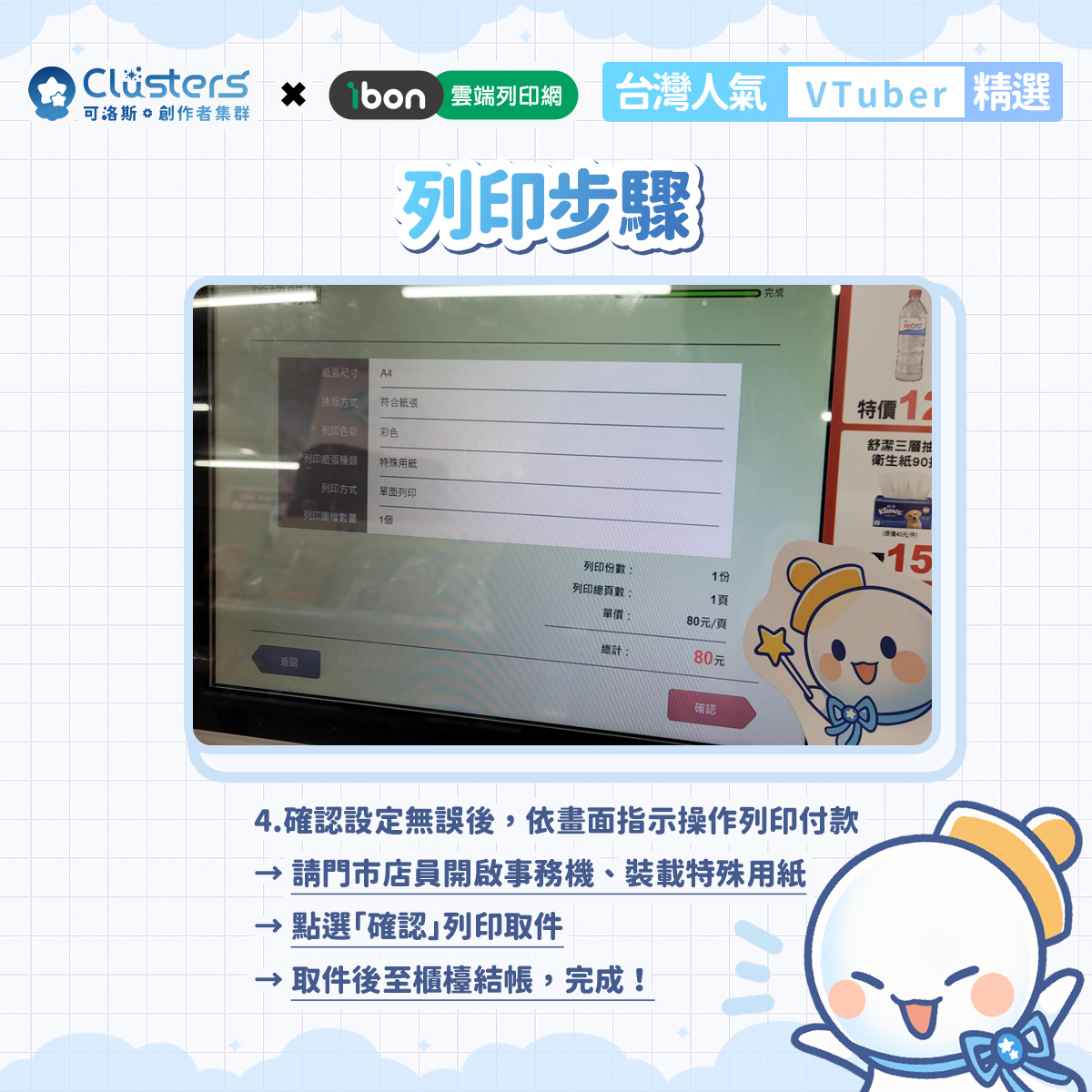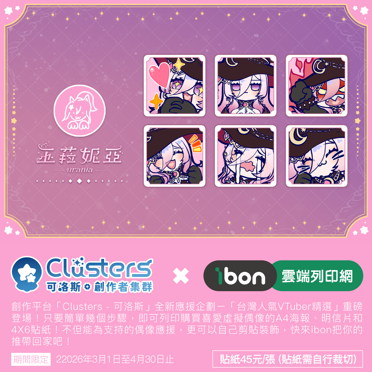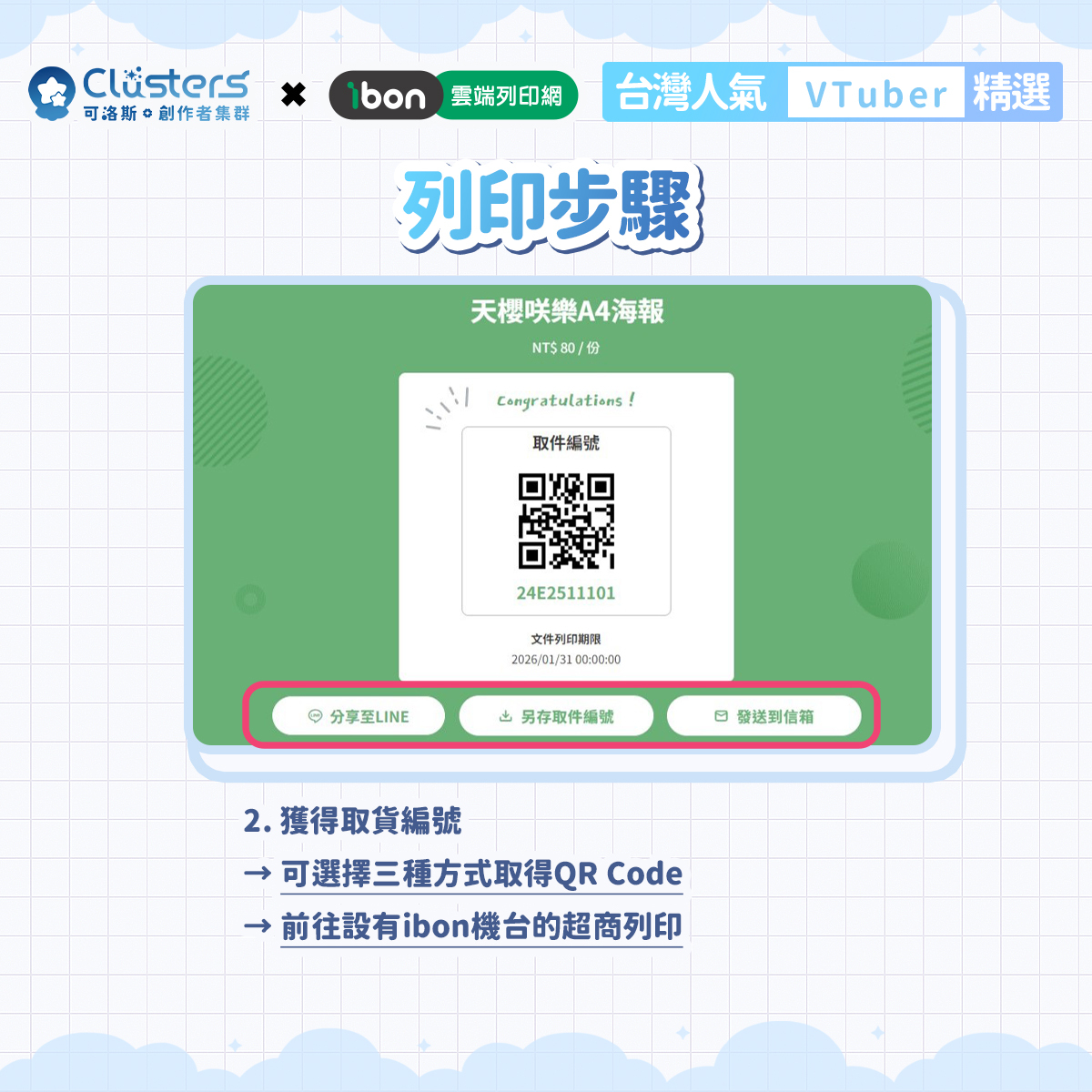 本企劃為台灣創作平台「Clusters-可洛斯.創作者集群」與「ibon 雲端列印網」,再度攜手推出的第四彈創作者應援企劃。粉絲只要前往全台設有 ibon 機台的便利商店,輸入取件編號或掃描 QR Code,便能購買喜愛 VTuber 的 A4 海報、4×6 明信片與 4×6 貼紙。 本企劃的銷售金額將有一部分直接回饋創作者,用行動支持大家的持續創作。