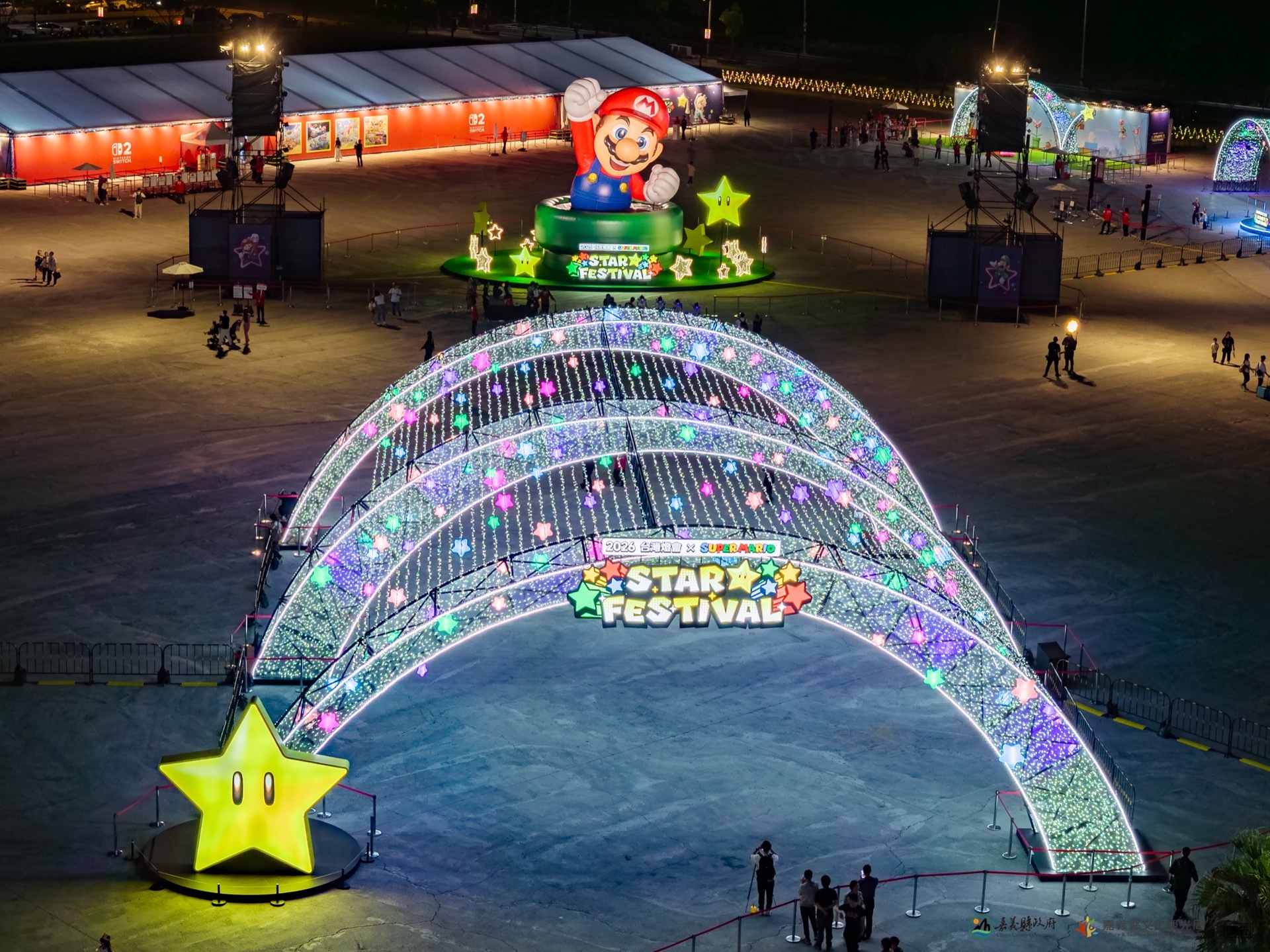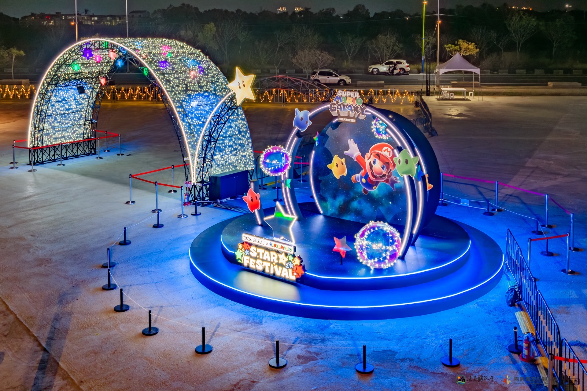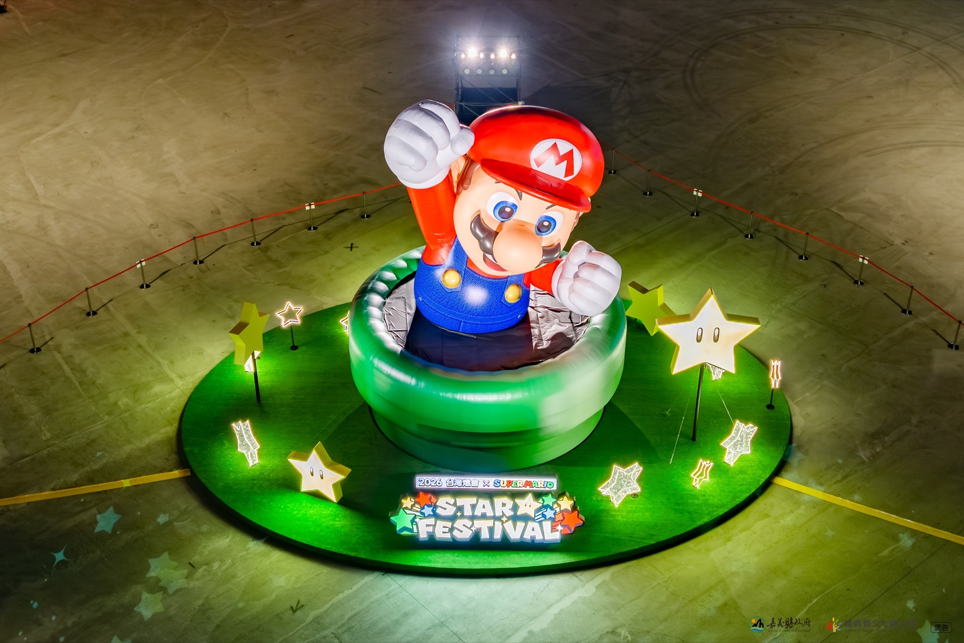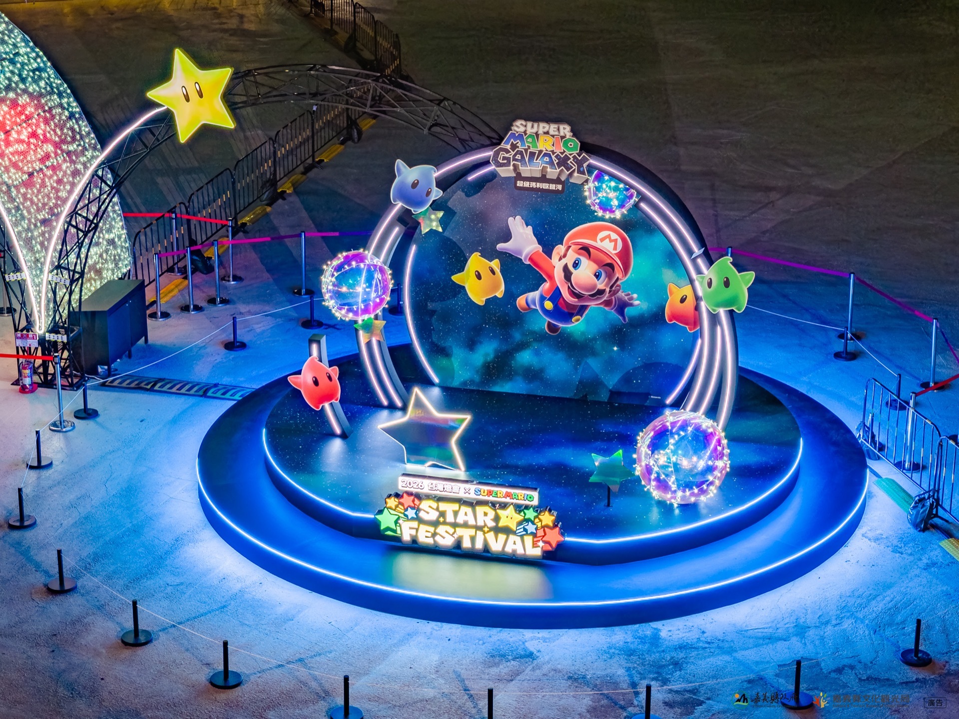 「GET THE STAR!超級瑪利歐主題燈區」作為本次星燦嘉年華的主燈,以高達 10 公尺的瑪利歐造型亮相,搭配星星元素與燈光設計,成為燈區中最醒目的焦點。燈區開放時間平日 14:00 開始、週五及假日(含開燈日)10:00 開始,白天呈現明亮的拍照場景;夜晚則配合星星造型燈飾與地面光影效果,讓民眾能從不同角度欣賞主燈的細節與樣貌。