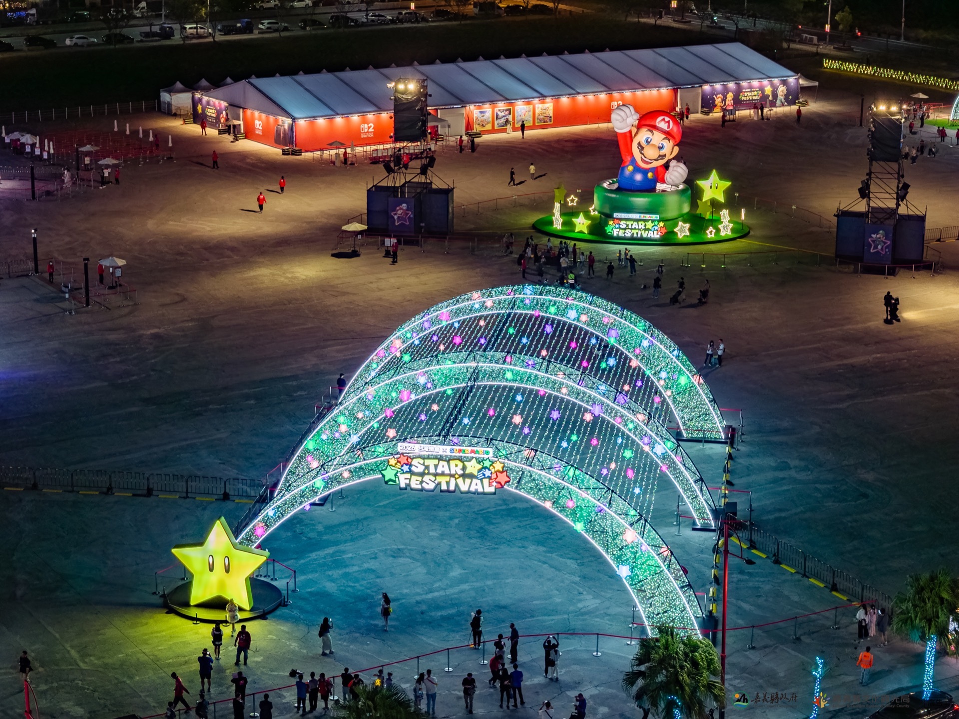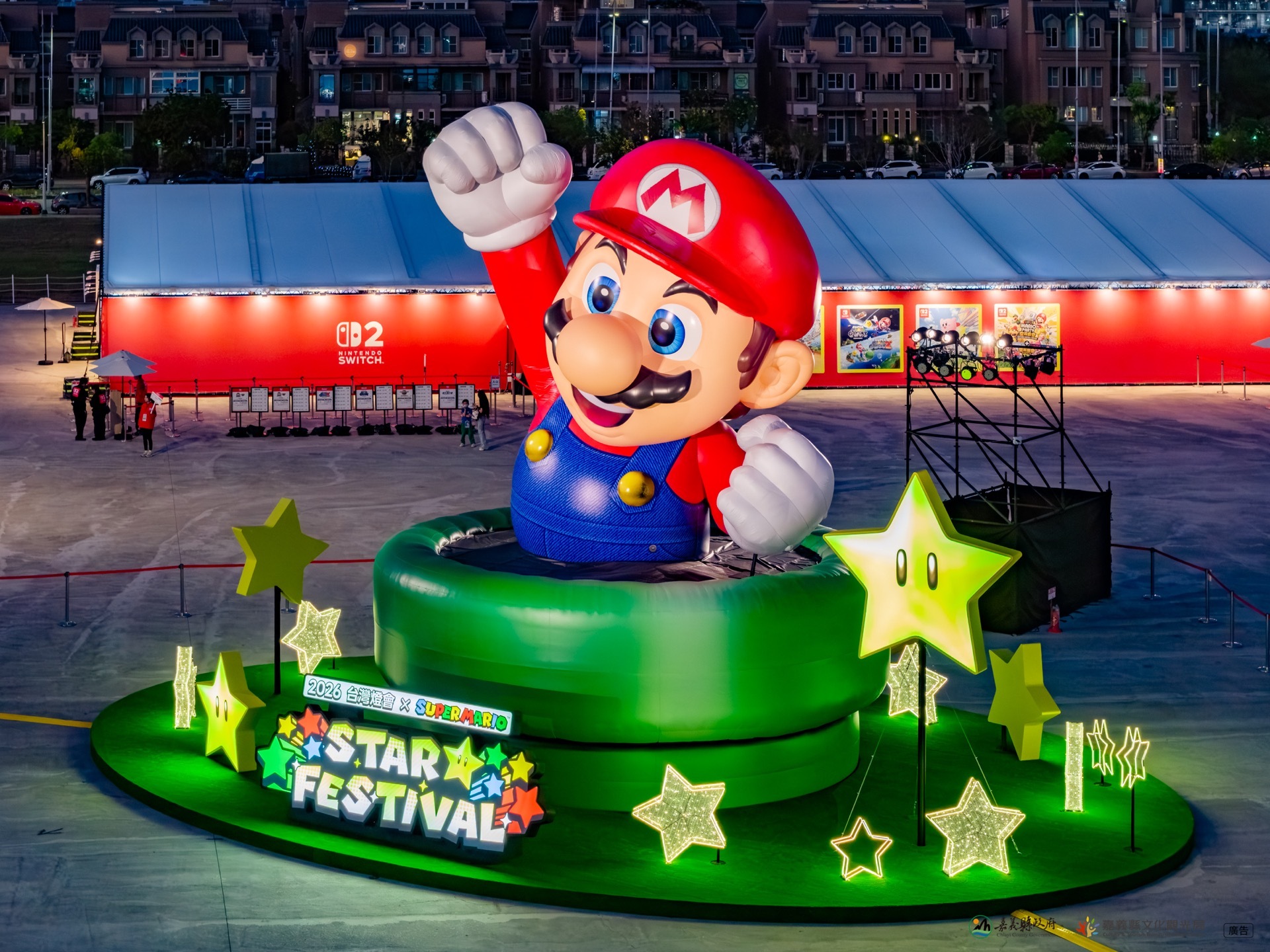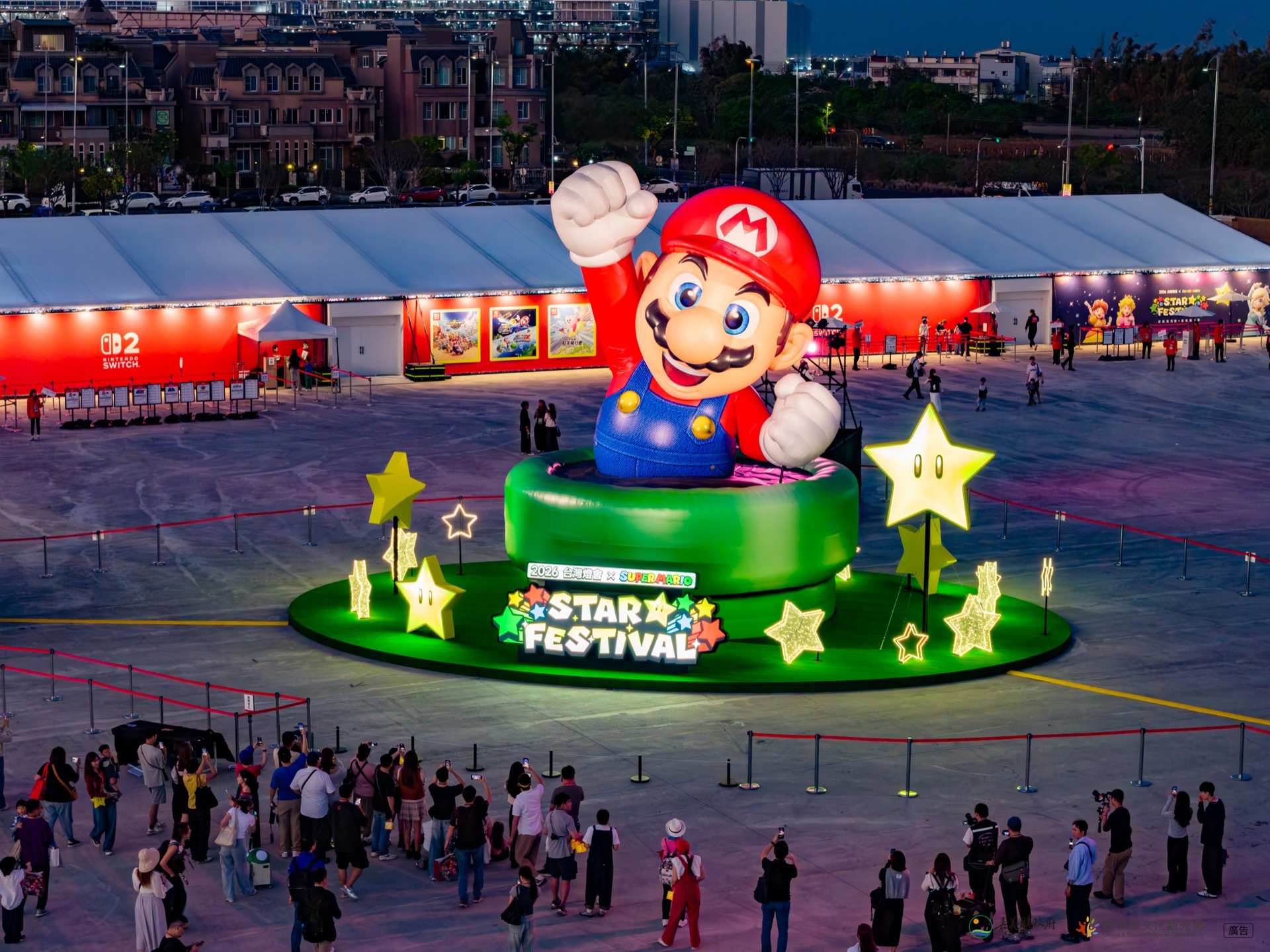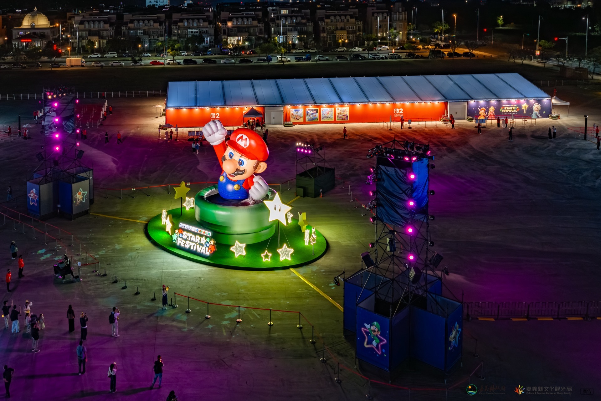 「GET THE STAR!超級瑪利歐主題燈區」作為本次星燦嘉年華的主燈,以高達 10 公尺的瑪利歐造型亮相,搭配星星元素與燈光設計,成為燈區中最醒目的焦點。燈區開放時間平日 14:00 開始、週五及假日(含開燈日)10:00 開始,白天呈現明亮的拍照場景;夜晚則配合星星造型燈飾與地面光影效果,讓民眾能從不同角度欣賞主燈的細節與樣貌。