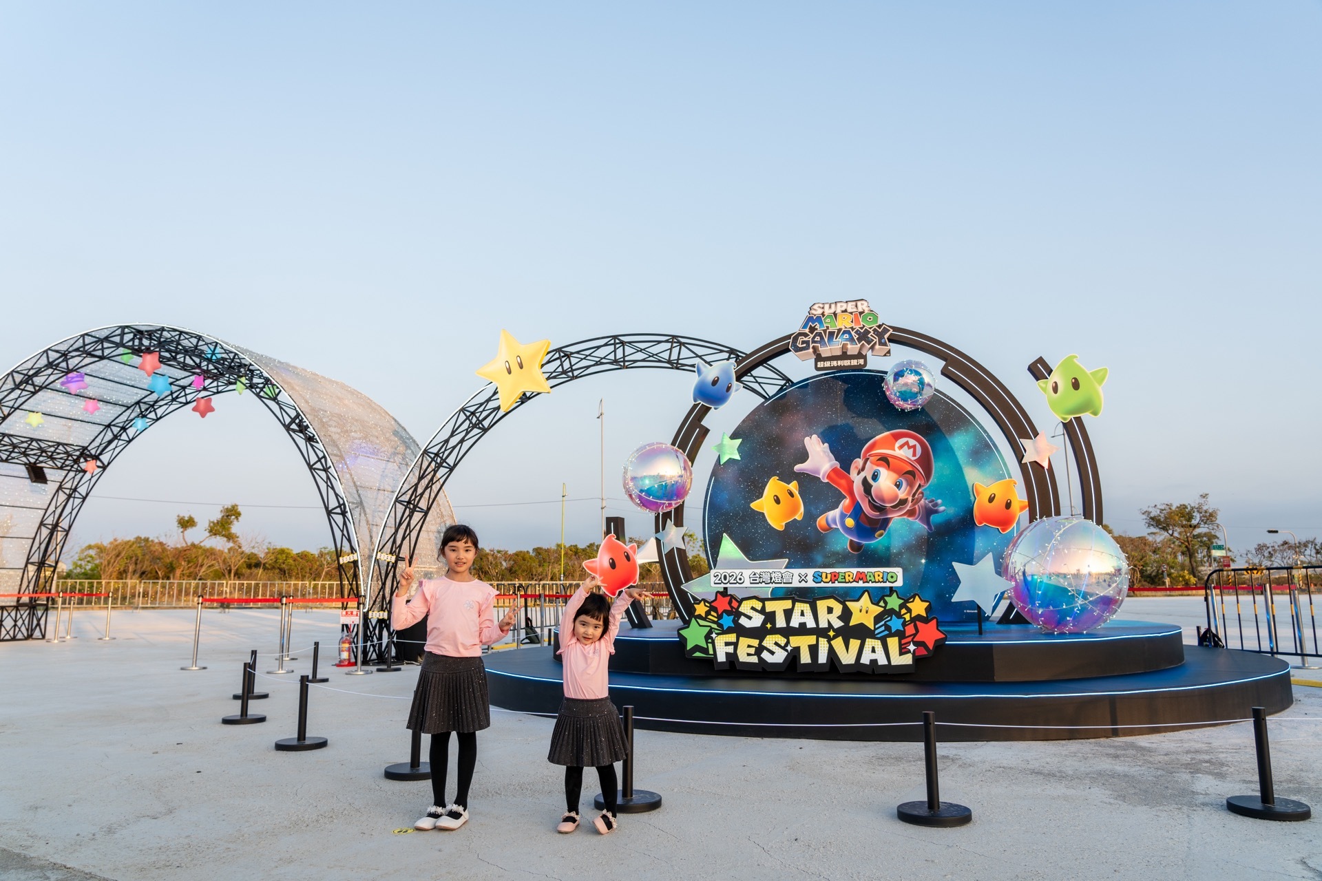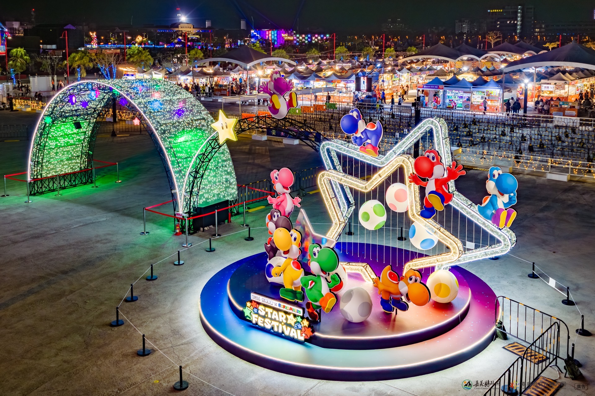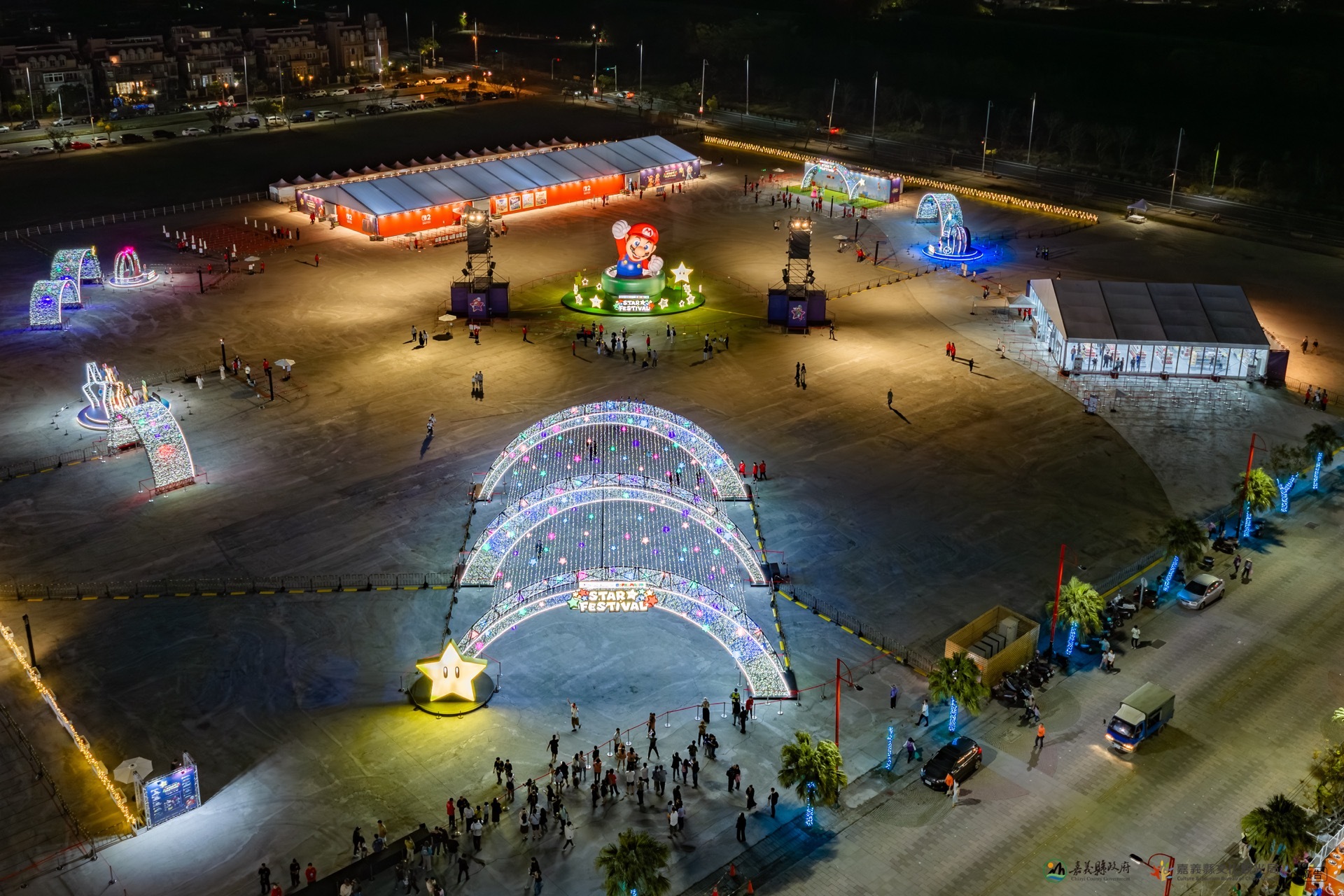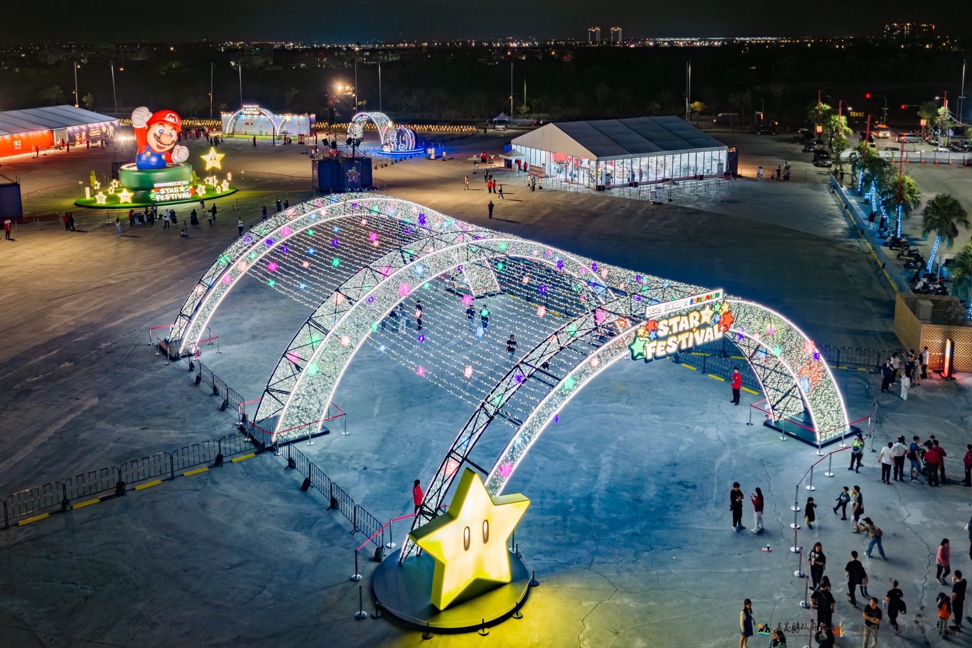 「GET THE STAR!超級瑪利歐主題燈區」作為本次星燦嘉年華的主燈,以高達 10 公尺的瑪利歐造型亮相,搭配星星元素與燈光設計,成為燈區中最醒目的焦點。燈區開放時間平日 14:00 開始、週五及假日(含開燈日)10:00 開始,白天呈現明亮的拍照場景;夜晚則配合星星造型燈飾與地面光影效果,讓民眾能從不同角度欣賞主燈的細節與樣貌。