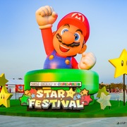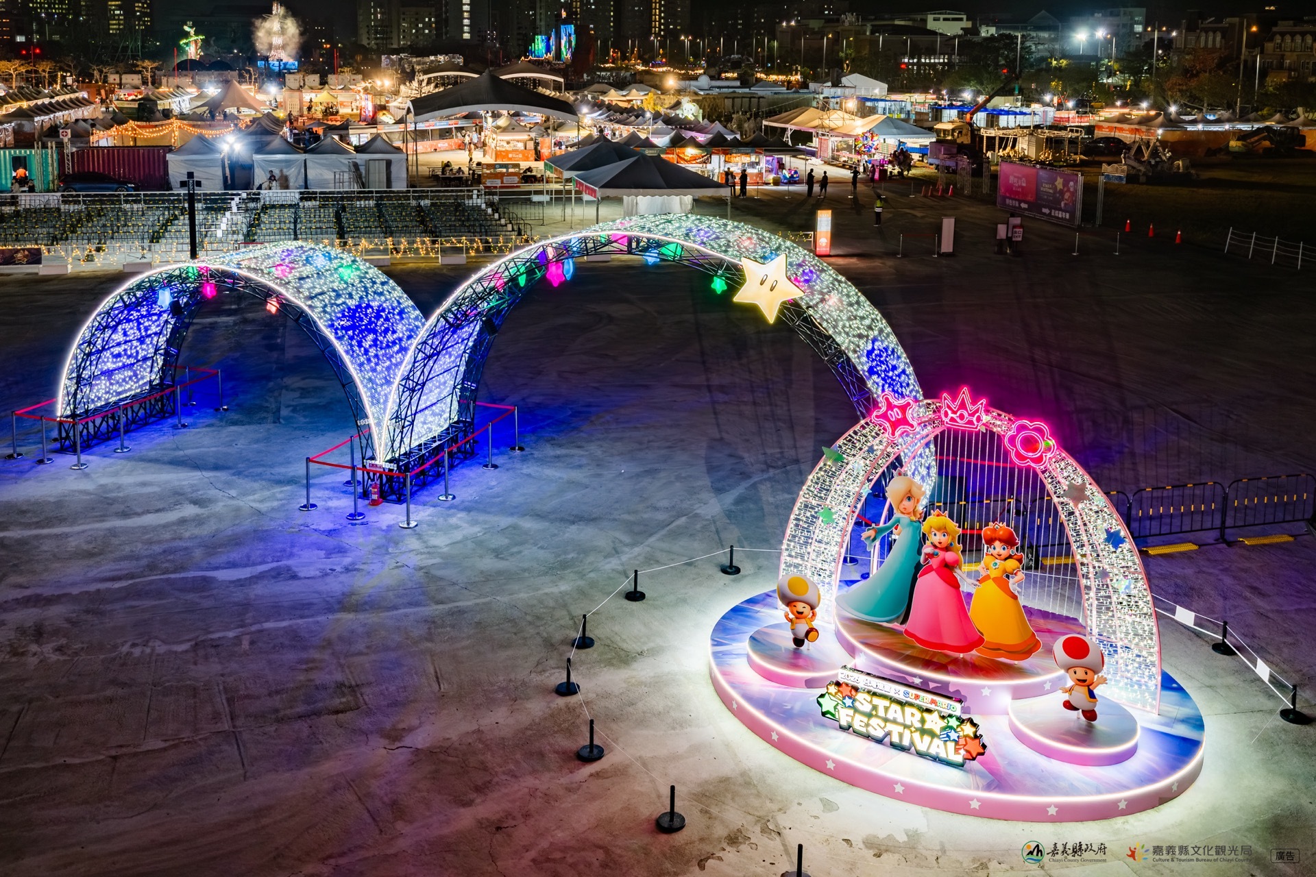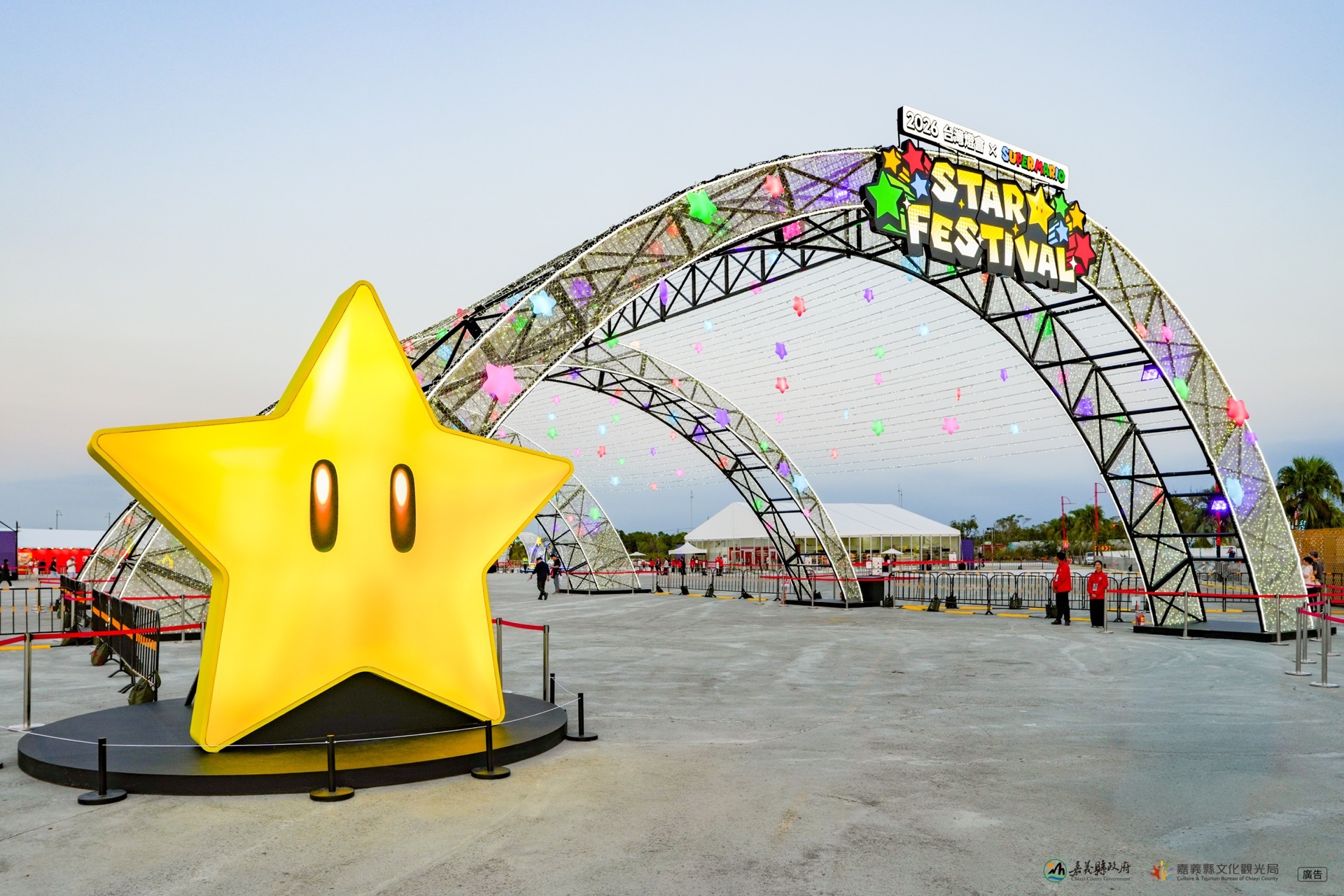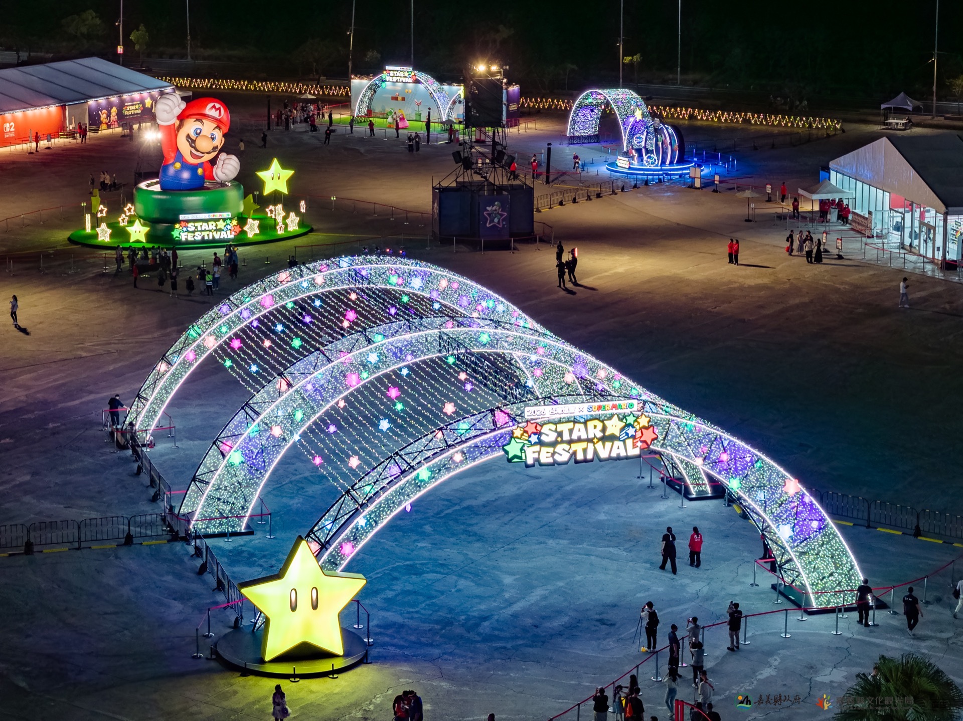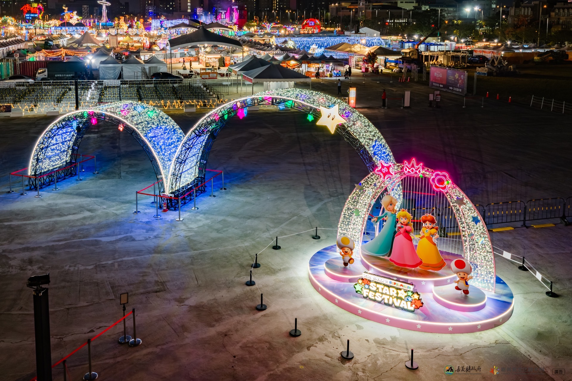 「GET THE STAR!超級瑪利歐主題燈區」作為本次星燦嘉年華的主燈,以高達 10 公尺的瑪利歐造型亮相,搭配星星元素與燈光設計,成為燈區中最醒目的焦點。燈區開放時間平日 14:00 開始、週五及假日(含開燈日)10:00 開始,白天呈現明亮的拍照場景;夜晚則配合星星造型燈飾與地面光影效果,讓民眾能從不同角度欣賞主燈的細節與樣貌。