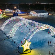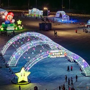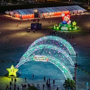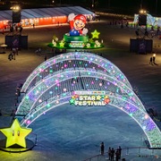 「無敵星迎賓之路」為燈會的動線起點,以無敵星與弧形燈光結構作為設計概念,搭配星星燈飾點綴,營造出明亮而充滿活力的燈區第一印象。入口處的大型無敵星點出此次「2026 台灣燈會 × 超級瑪利歐・星燦嘉年華」主題,為親子燈區後的首個拍照亮點。