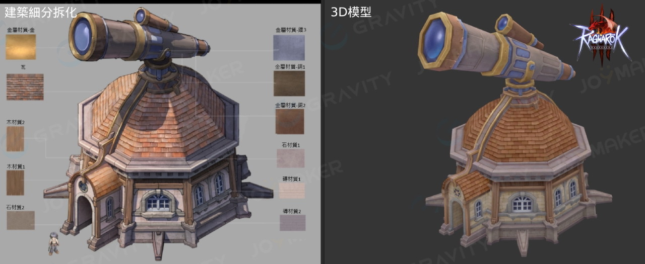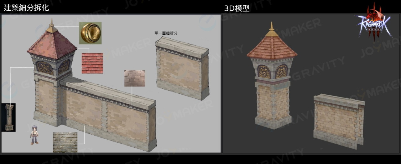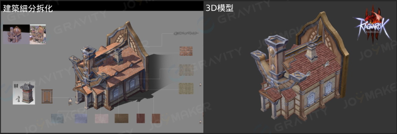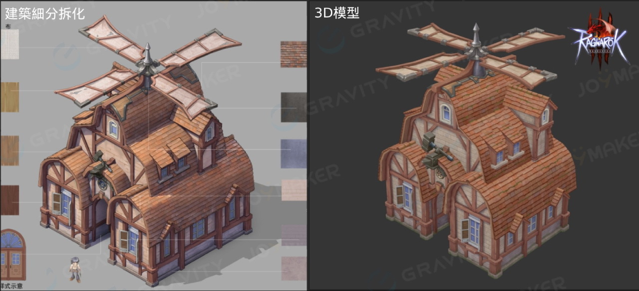 仙境傳說》的設定比例,3D 模型也細緻保留手繪繪本般的質感,透過屋瓦、窗框與牆面等細節層層堆疊,重現北歐神話世界的神秘感與宏大氣勢,設定圖中也特別加強了承襲神話底蘊的細節描寫。