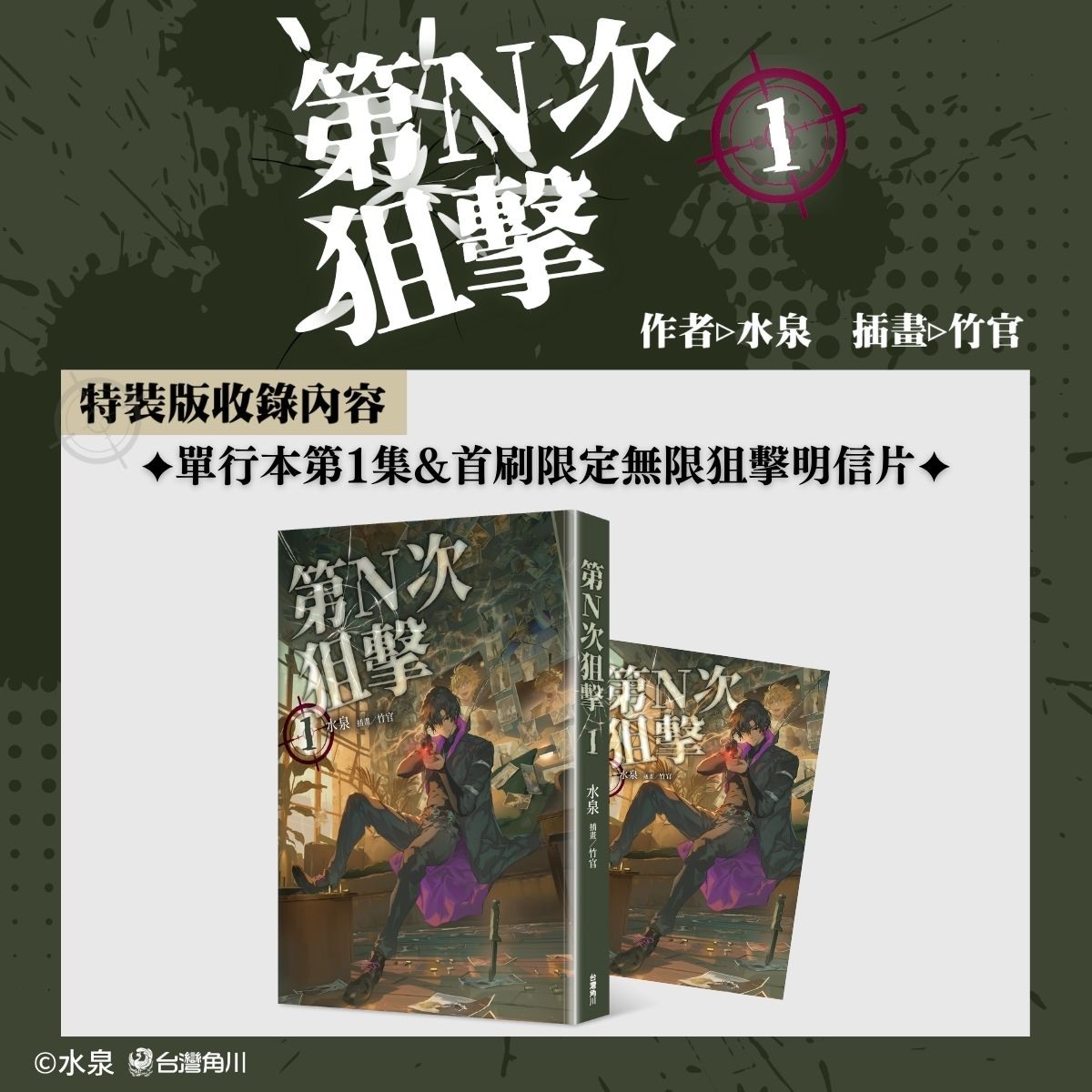 為慶祝水泉×竹官老師全新奇幻力作《第N次狙擊1》上市,4/23至5/31,台灣角川官網、實體特約書店與指定網路通路,同步推出水泉系列作品通路活動,特裝版85折、單本79折、兩本以上75折(《第N次狙擊1》新刊特裝版不折扣),包含《