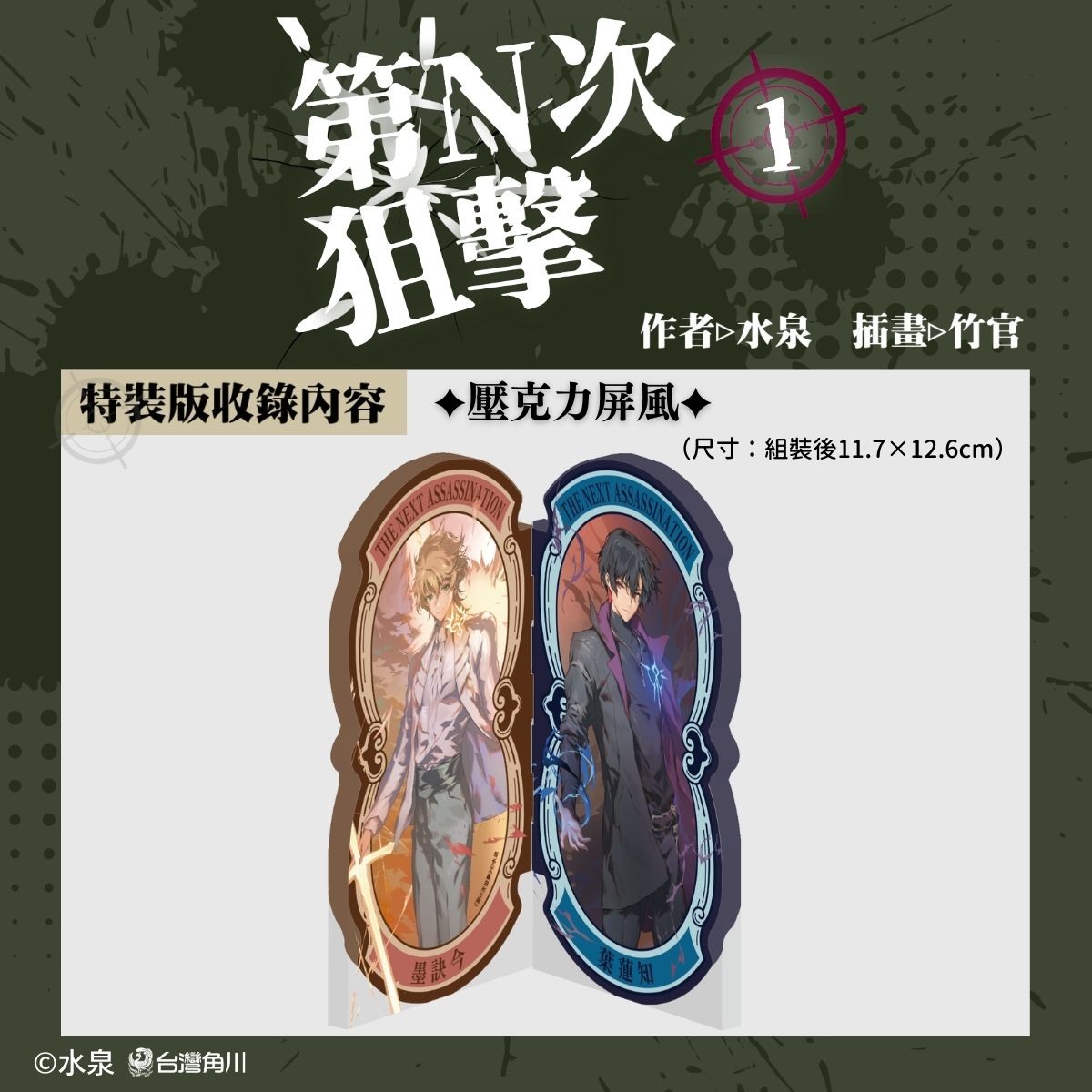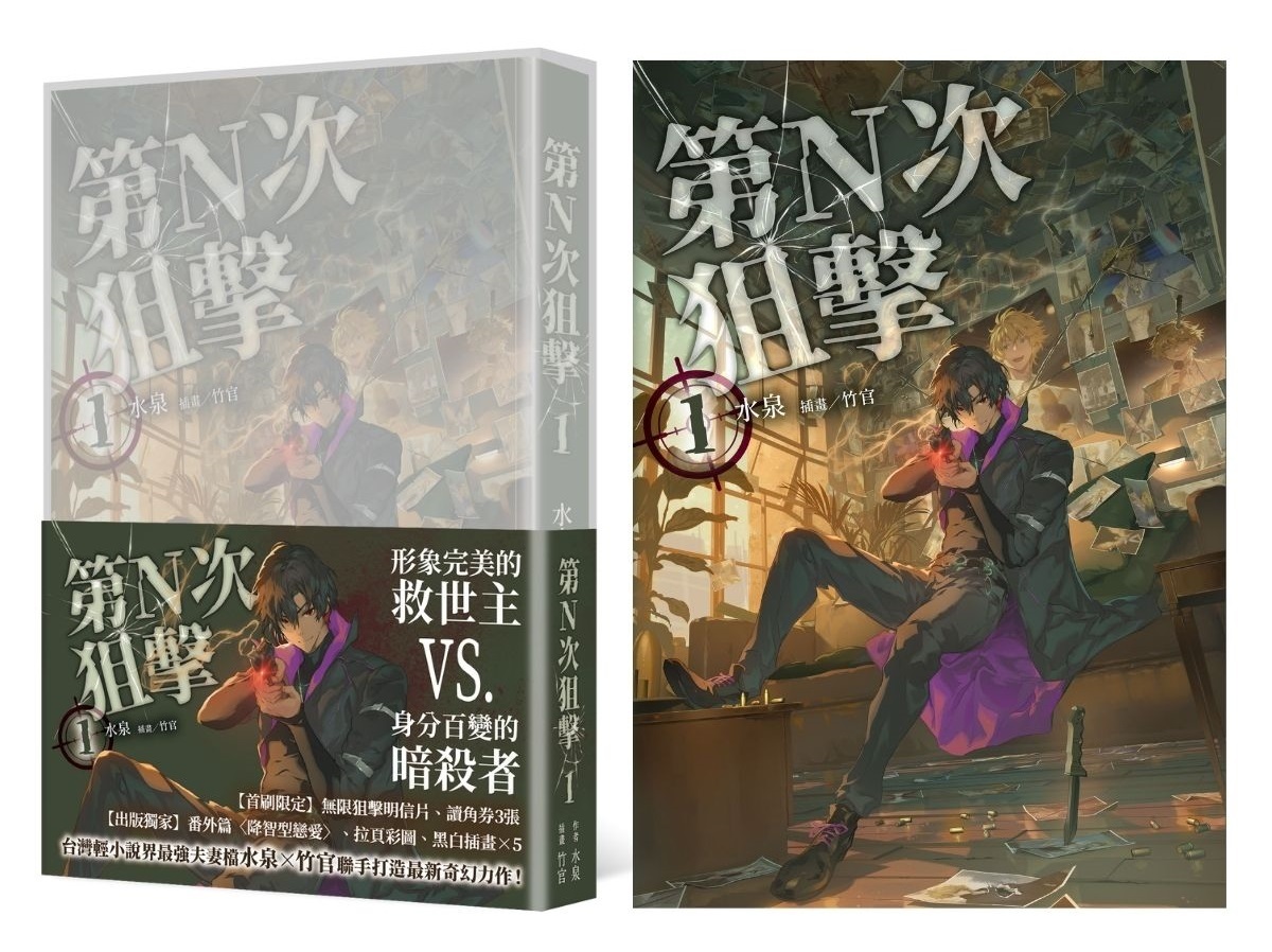 世人皆被蒙蔽,唯有他為阻止毀滅而孤軍奮戰──《第N次狙擊1》將推出一般版、典藏特裝版與電子書版。一般版首刷特典為「無限狙擊明信片」(※首刷售完即無贈品)、KadoKado 角角者「讀角券3張」,特裝版則多收錄呈現「救世主與暗殺者」對立場景的限定周邊「壓克力屏風」和「精美對立典藏畫」。電子書版則於5/1(五)上架並附贈專屬特典書卡。無論實體書或電子書,讀者都能完整珍藏水泉老師的最新力作《第N次狙擊1》。