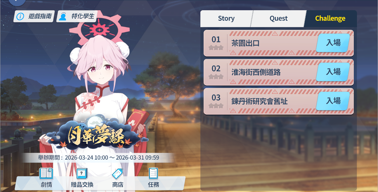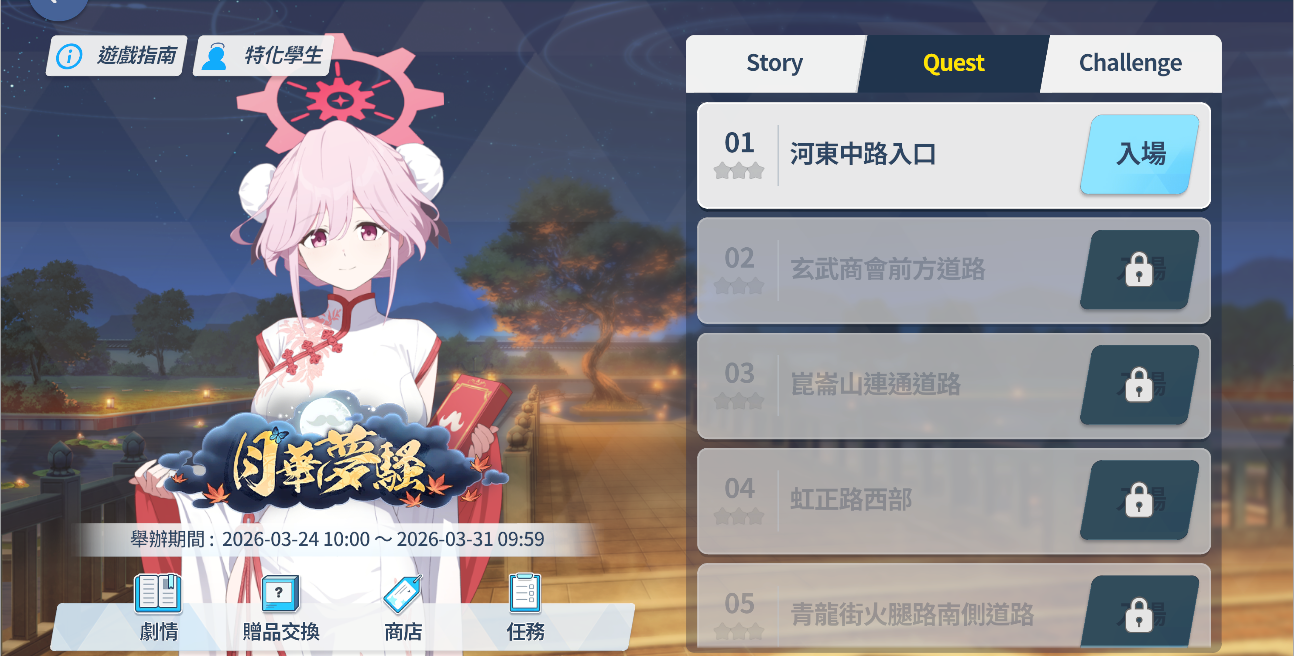 - 完成「任務 (Normal) 2-3」時可以進行「月華夢騒」活動。