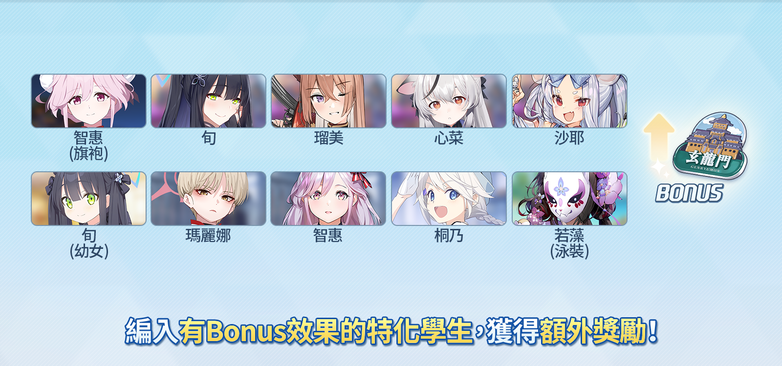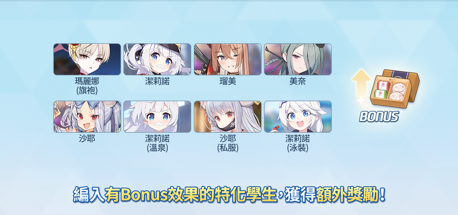 - 使用特化學生通關,可在之後的重複獎勵中獲得更多獎勵。