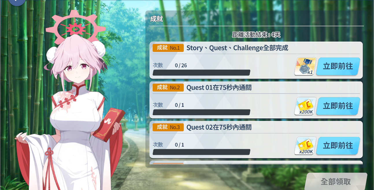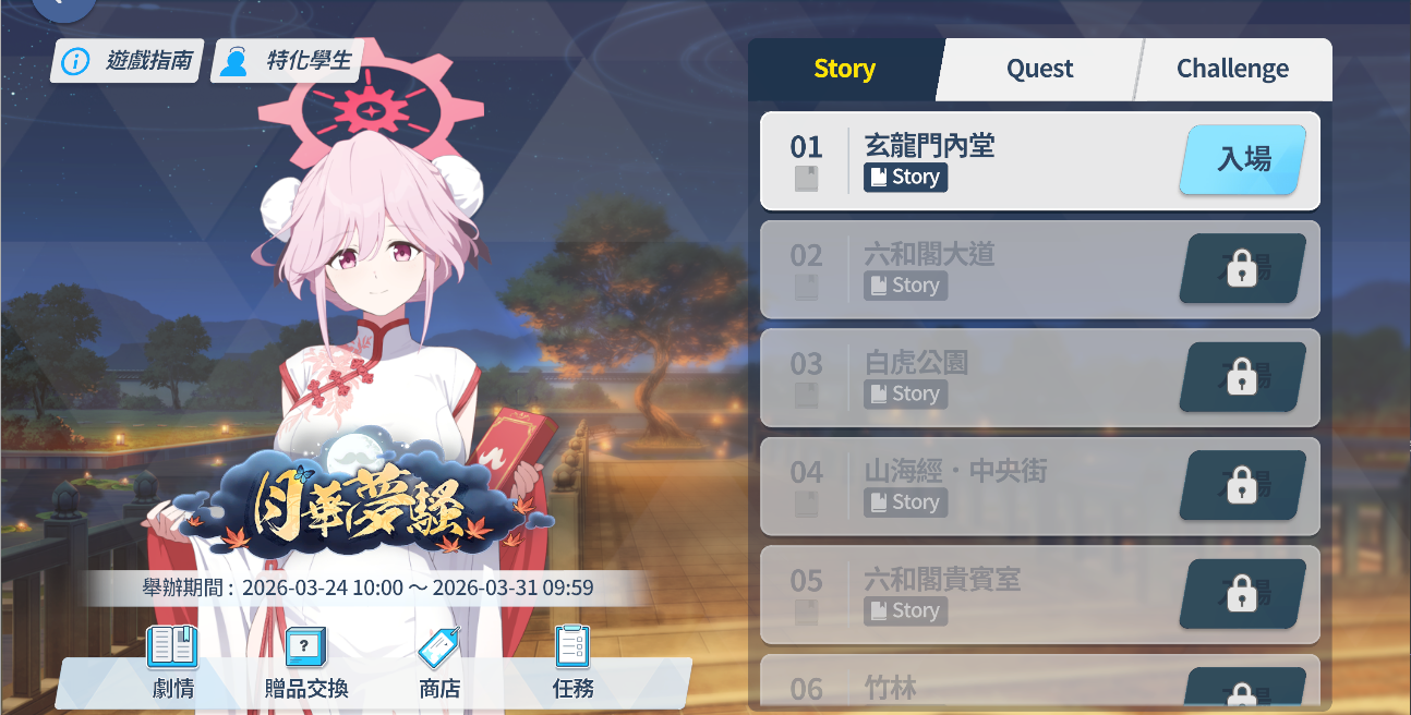 - 活動劇情由包含戰鬥的 Story、Quest、Challenge,以及可查看章節的「劇情」,還有與獎勵相關的「商店」、「任務」、「贈品交換」等選單所組成。