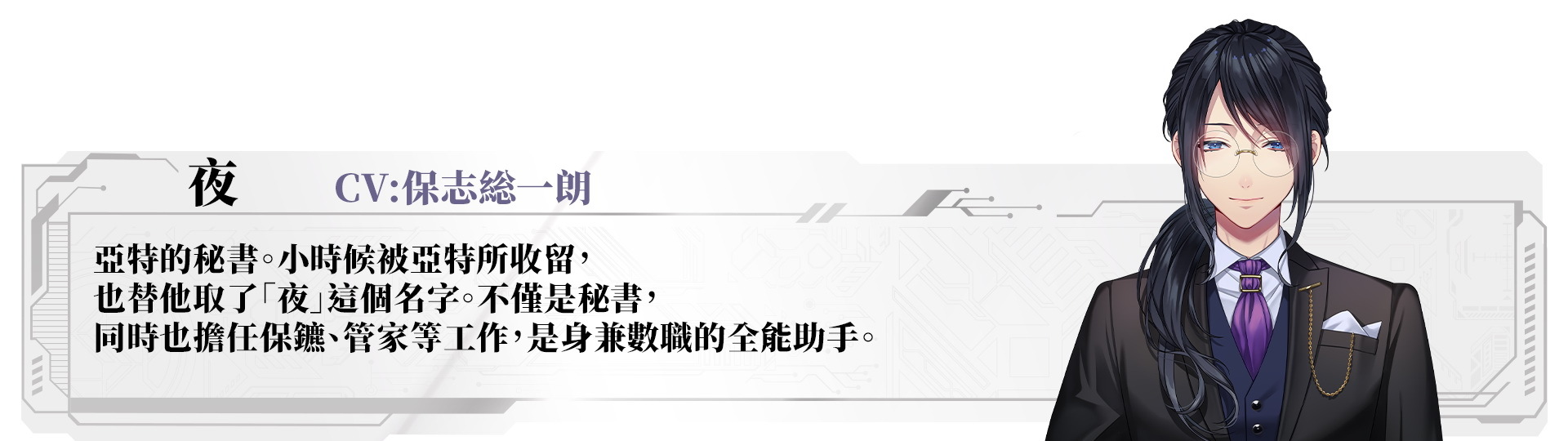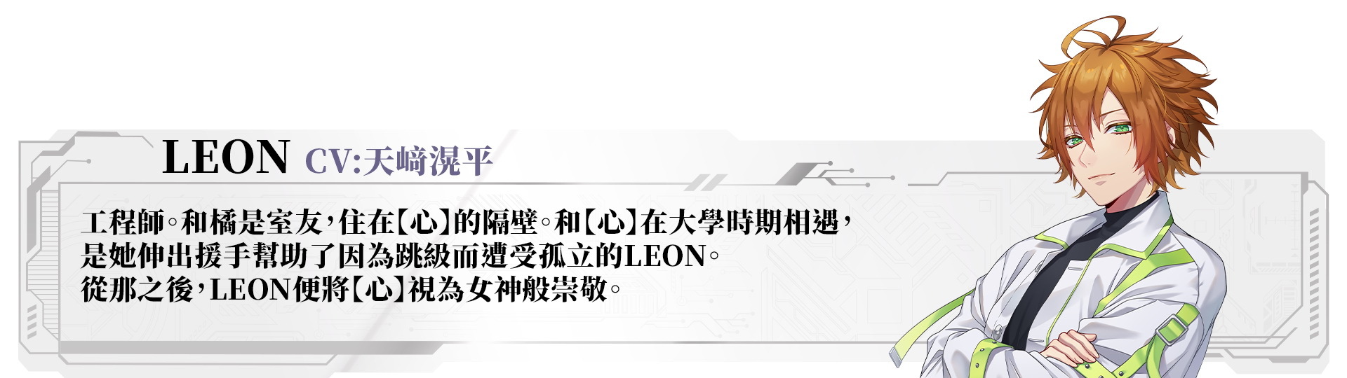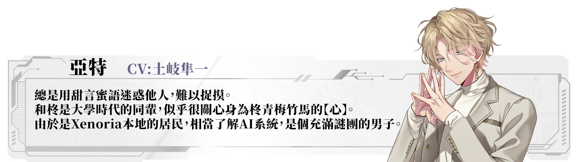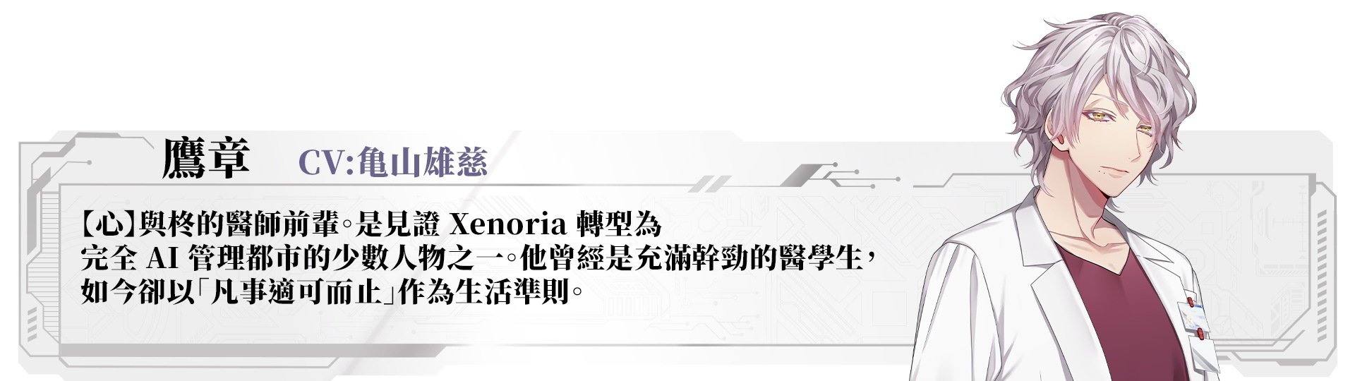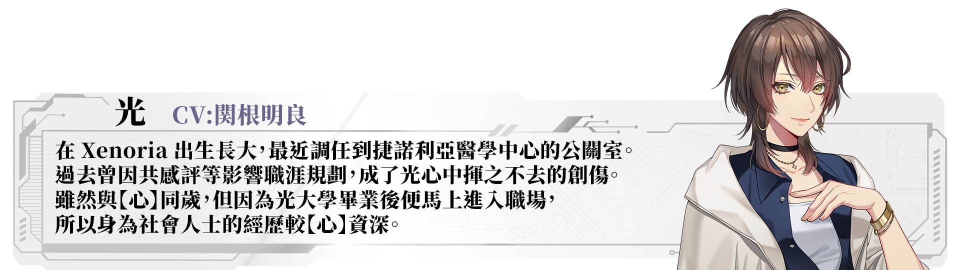 與主角任職同一間醫院的精神科醫師「柊」;對主角相當親近、身為鄰居的「橘」;總是在關鍵時刻伸出援手、充滿謎團的「亞特」一角,三名攻略角色的聲音分別由深町壽成、石谷春貴、土岐隼一飾演。此外,各角色路線中登場的支援角色,以及先前尚未公開的「光」角色視覺圖與聲優資訊,也於本次一併揭曉。