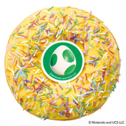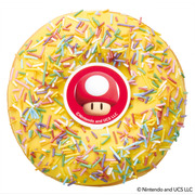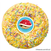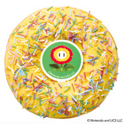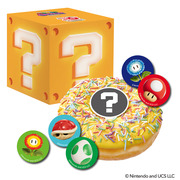 內含一個裝在問號磚塊形狀方形盒子裡的甜甜圈。甜甜圈表面裹著一層卡士達風味糖霜,
