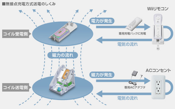 該套件採用電磁感應式非接觸充電,充電座與電池包中都配備有線圈,充電時透過線圈間的電磁感應,將電力從充電座傳輸到電池包,因此不像其他 Wii 遙控器用充電座般必須透過金屬接點來充電。使用時只要隨手將 Wii 遙控器置放到充電座上,不用刻意對準接點或是插上接頭,就能以非接觸方式安全便利的進行充電,不論老幼都能輕鬆使用。
