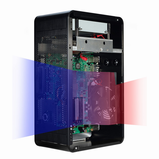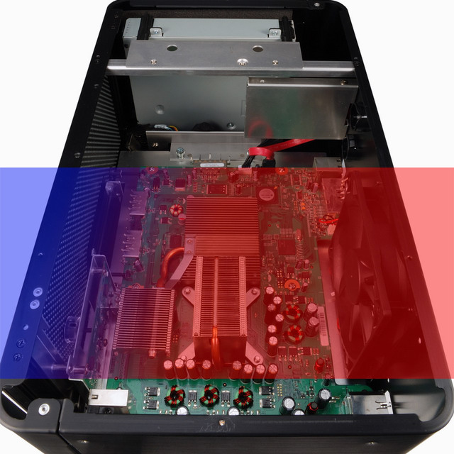 在散熱部分,PC-XB01 將原本配置在繪圖晶片上方的光碟機移至機殼頂端,讓主機板上的 2 大熱源-處理器與繪圖晶片上方淨空,搭配前方面板通透的進氣孔,以大尺寸的單 12cm 散熱風扇來取代原有的雙 7cm 散熱風扇與鋁合金導風罩,強化整體散熱效果。