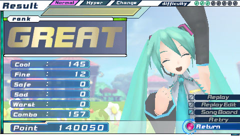 在音樂節奏遊戲模式中,玩家將依照畫面上的節奏圖示按下對應的按鈕,輸入時機正確就可以聽到初音的歌聲流暢播出,輸入失敗初音的歌聲就會中斷。當滿足特定條件時,會出現初音表情與動作的特寫畫面,讓玩家沉浸在現場即興演唱的氣氛中。之外並提供難度較高的「挑戰區域」,正常過關後即可欣賞初音跳舞的影片以及取得稀有道具。