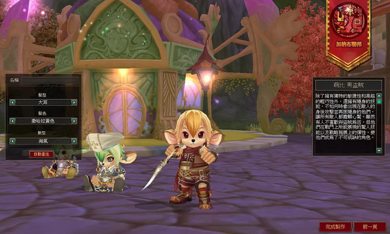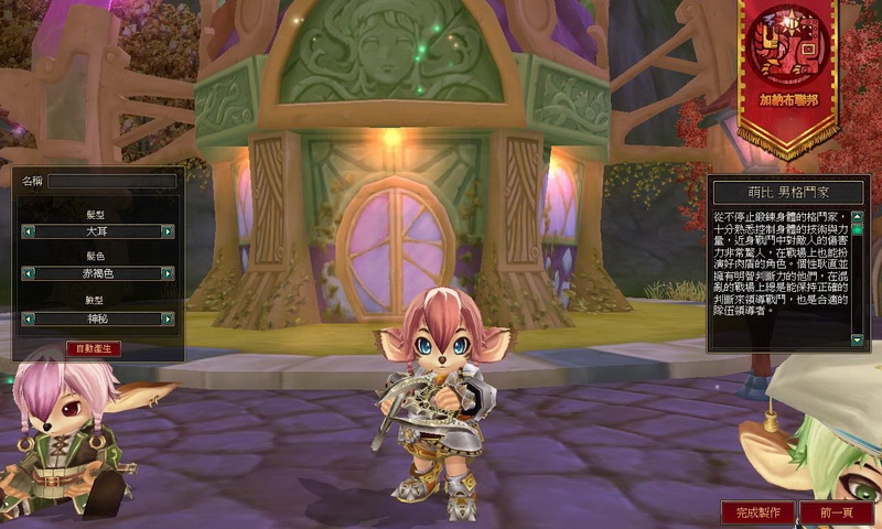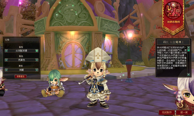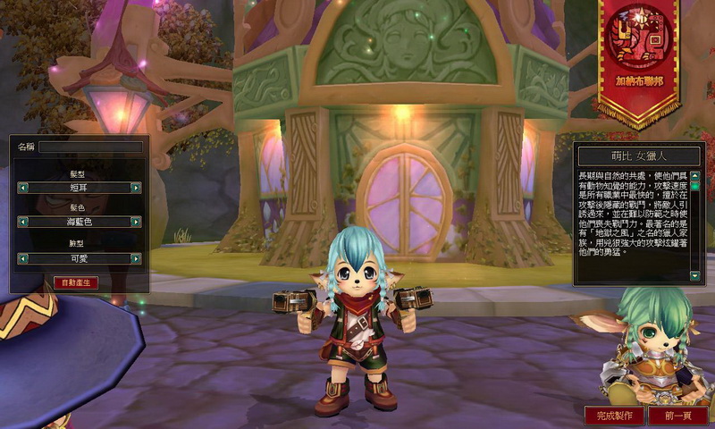 巴哈姆特 GNN 選擇了加納布聯邦、萌比族女性獵人,在輸入角色名稱的同時,還可以選擇角色的髮型(萌比的髮型是選長短耳朵)、髮色、臉型(可以選擇聰明、害羞、俏麗等),點下完成製作後,專屬於個人的角色就誕生了!