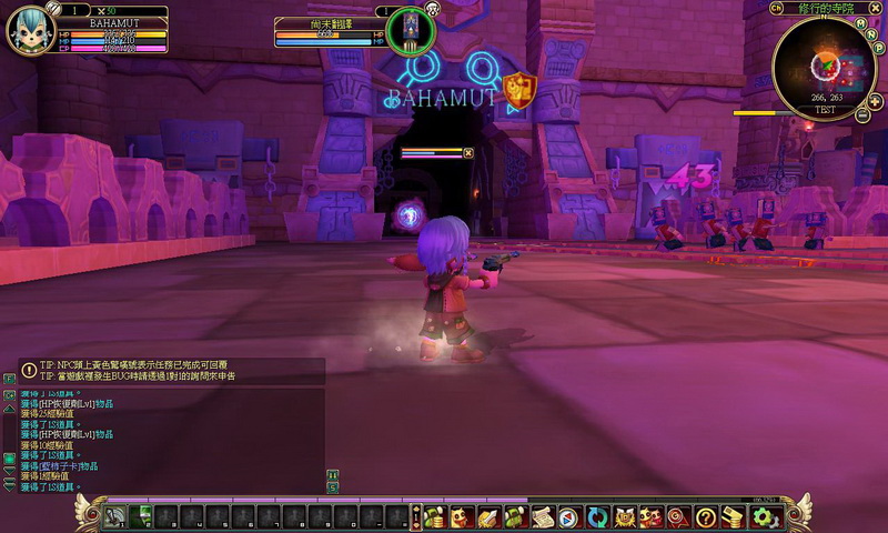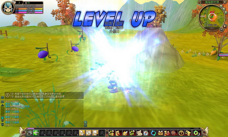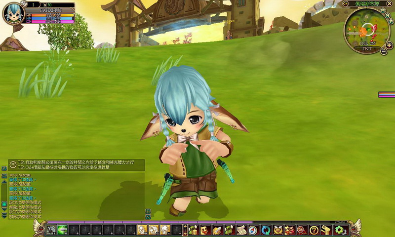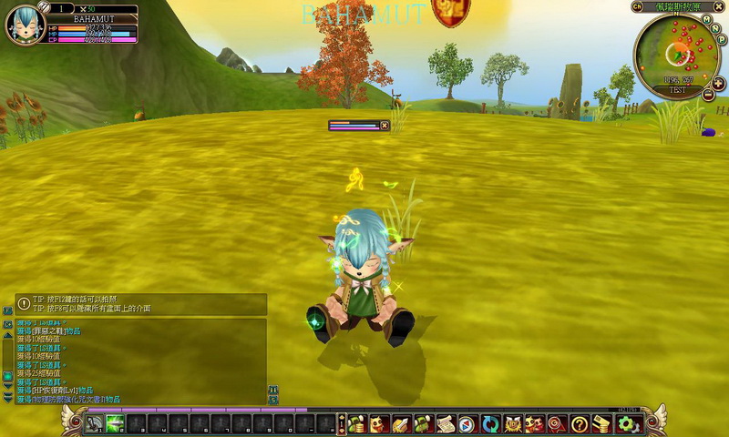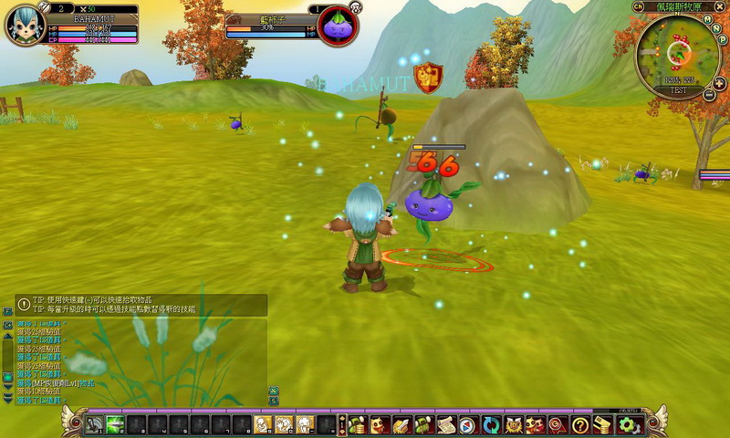 獵人角色運用雙槍攻擊時,相當具有射擊爽快感,可以砰砰砰拼命打怪,且會伴隨著聲光效果的華麗招式,怪物模樣也很古錐,像這藍柿子怪臉帶笑容的撲過來,叫人怎麼打得下去啊~不過,為了活命,還是得忍痛掛掉柿子怪,有時怪物死亡後會留下寶箱,只要運用 ~ 鍵就可撿起,掉落的物品除了藥水外,還有像裝備、柿子卡、防禦強化咒文書等物品;然而,打怪打久了,總是會損血,只要按下 F2 鍵就可以坐下回血,而小萌比回血的模樣有點像是在打瞌睡,相當可愛喔!