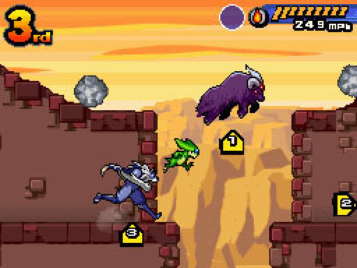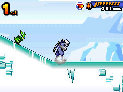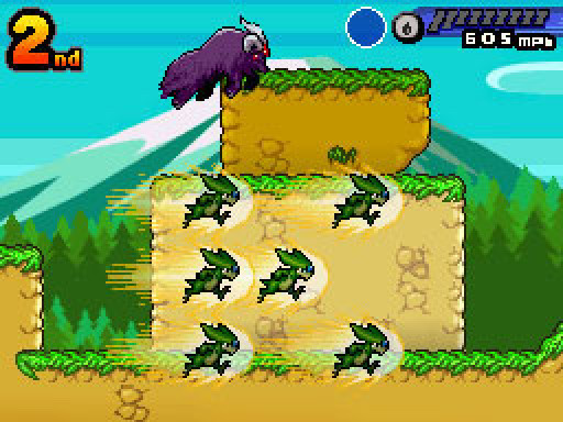 競速比賽採 2D 橫向捲軸方式進行。每個賽道都具備地形起伏與落差,並隱藏有各式道具與機關。把握正確的時機來使用能瞬間加速的「加速」是攻略的重點。收錄會噴發熔岩的火山、容易滑溜的冰原等多變的賽道,選擇合適的怪獸參賽將能事半功倍。