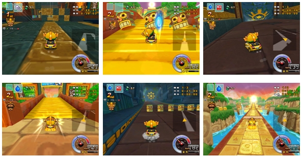 新推出的賽道地圖「黃金文明之勇闖黃金城」屬於道具賽道,難度 2 顆星,由於道路較為寬闊,非常適合初學者練習,而進階玩家則可沿著貼邊路線閃避水球的猛烈攻擊。同樣屬於道具賽道的「黃金文明之危機四伏」,難度 3 顆星,以直線、方正路線為主,地圖中搭配高低起伏路線及簡易機關設計,在起跑的上坡窄道,非常適合施放水球攻擊。