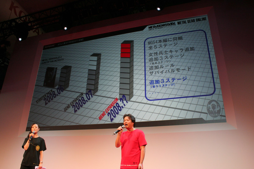 已經在 6 月推出的《潛龍諜影 4》以及《潛龍諜影 Online》,本次仍舊參與了現場的展出,除了設置小型試玩區與 SCEJ 攤位進行《潛龍諜影 Online》的連線對戰試玩之外,並請到製作人小島秀夫以及參與演出的菊地由美與井上喜久子進行《潛龍諜影 4》的舞台活動,以及發表《潛龍諜影 Online》第 2 款資料片的內容與舉辦世界大賽總決賽。
