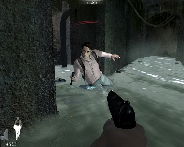 音樂部分也是相當熟悉而且快速的旋律,讓遊戲的刺激程度就像心臟被揪緊般無法呼吸。進入炸開的洞中,隨即轉入潮濕陰暗的下水道,視覺效果也相當優異,不論是從壁面滲出的水流,還是深及腰部的水溝,以及浮載浮沉的垃圾,都有相當真實的表現。