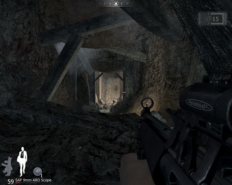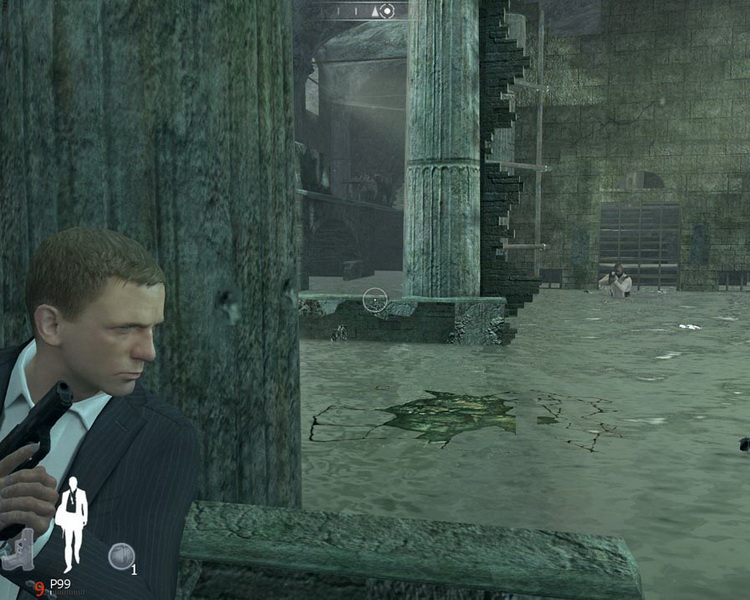 槍殺敵人對於喜愛射擊遊戲的玩家來說是輕而易舉的事情,不過遊戲還安排了第三人稱視角的射擊方式,由於詹姆士龐德一向是單槍匹馬潛入敵區,因此對於尋求掩護的行進方式可說是相當重要的技巧,任何壁面或是桌椅等物品都可以為玩家提供掩蔽,不過因為物品材質不同,子彈貫穿程度也不同,玩家要注意掩蔽物是否太脆弱,而讓自己提早曝光陷入危機當中。