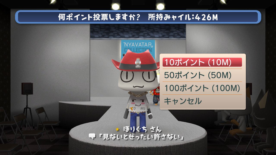 另外,進入此模式中觀賞的玩家,也可以花費遊戲中賺取的「喵幣(みャイル)」來投票給自己欣賞的玩家,並可查詢該玩家穿著的服飾來作為自己裝扮的參考。