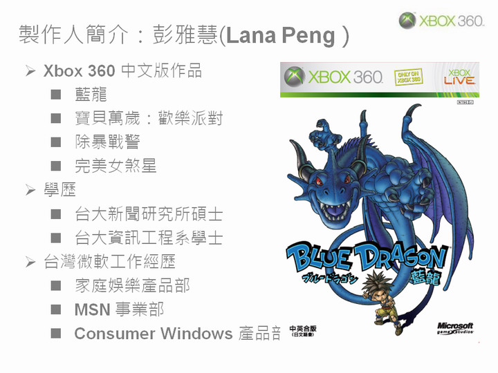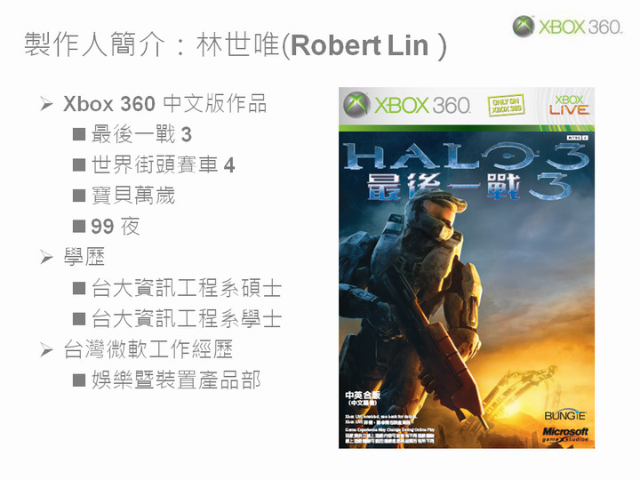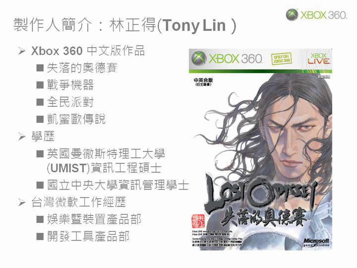 張:我是台灣微軟娛樂暨裝置事業處產品研發部負責人張書良,進入台灣微軟工作已經 11 年,最初任職於行銷部門,後轉任產品研發部門。目前領導產品研發部,負責台灣微軟娛樂暨裝置事業處各種軟硬體產品的研發與測試工作中包括遊戲中文化的製作。