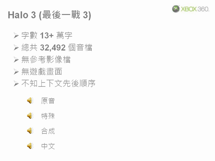 最後一戰 3(Halo 3)》時,原廠 Bungie 是不讓開發中的遊戲離開開發總部的,只允許在最後測試階段派人親自到他們總部確認製作成果。所以在翻譯和配音期間我們並沒有看過遊戲的畫面內容,因此沒辦法去一一確認配音合不合適,只能瞎子摸象般把數萬句台詞一股腦全部配完送過去。