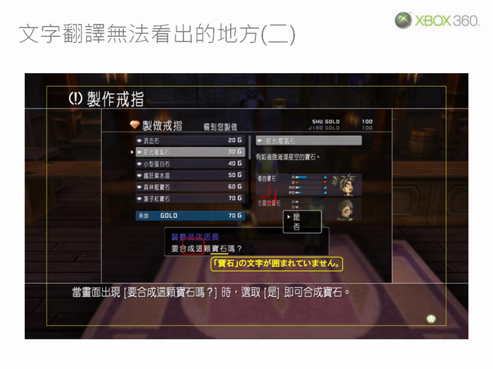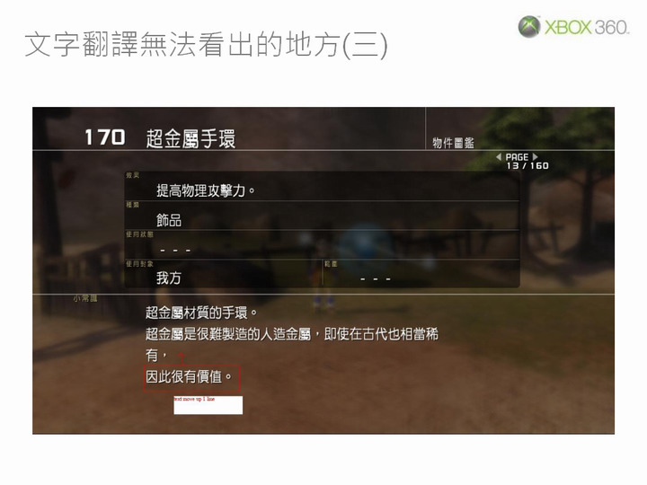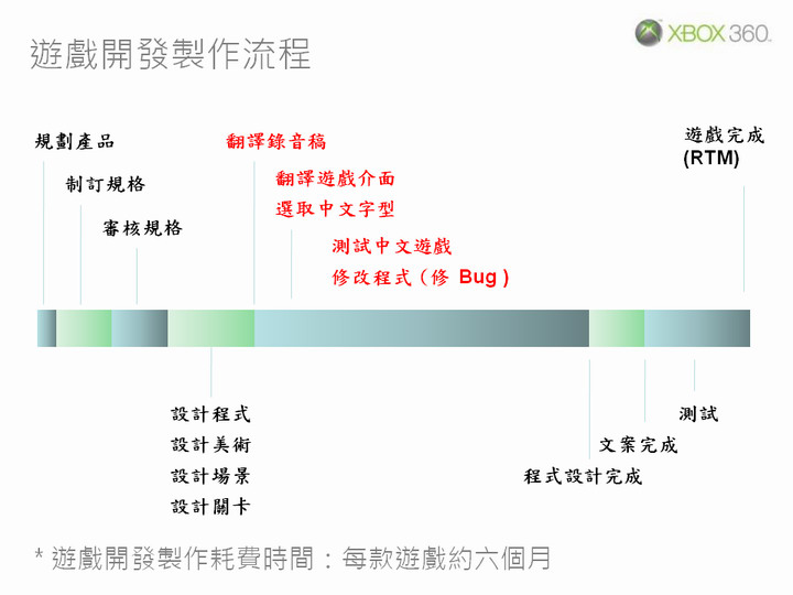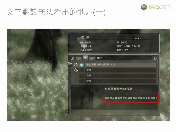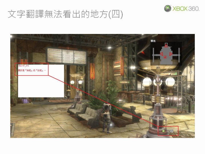 張:測試時除了中文化相關部分之外,還必須同時進行功能測試,以確保遊戲在中文化之後能滿足 Xbox 360 平台的技術認證規範(TCR,Technical Certification Requirements)。