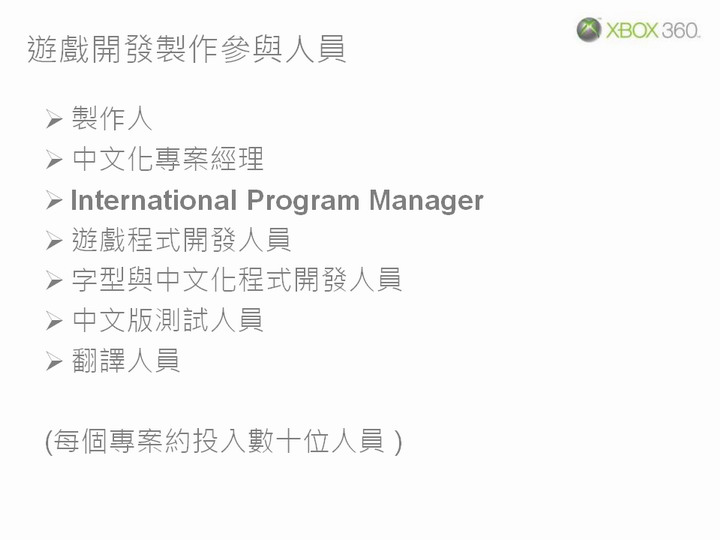 遊戲中文版的成本單從產品研發部這邊很難確切估算。在 Xbox 360 微軟自家遊戲部分,原則上是盡可能達成全面中文化的目標,銷售量高低不是絕對的考量因素。