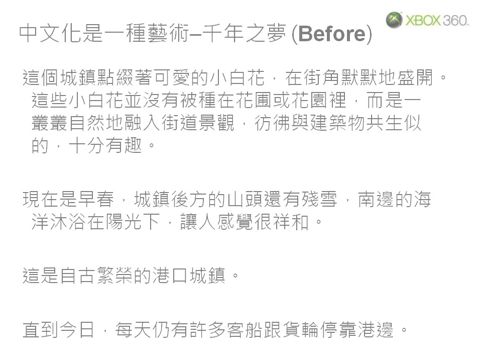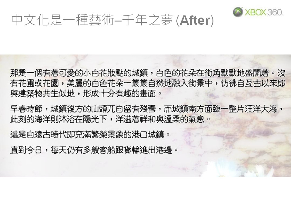 舉例來說,目前 Xbox 360 系統軟體只提供注音輸入法,對於不使用注音符號的香港玩家來說,等於是沒有辦法在 Xbox 360 上使用中文輸入功能。因此我們目前正在著手進行 Xbox 360 其他中文輸入法的研發,希望能盡快讓香港玩家也能使用中文輸入功能。