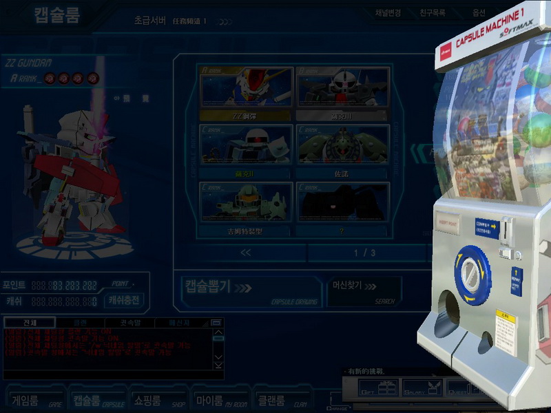 玩家透過扭蛋機隨機轉出不同的機體,依轉蛋機的型號不同,每次轉蛋所花費的點數以及轉出的機體多少有點差異,玩家可以點選轉蛋機上的機體,預覽機體的外型以及屬性。