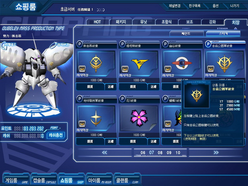 進行完新手教學後,玩家可以透過扭蛋機取得鋼彈機體。取得機體的方式基本上有二種,一種是使用 M 幣購買 Coin 轉扭蛋機,第二種則是用遊戲 G 幣或是 M 幣到商城內點數來購買或是租賃。
