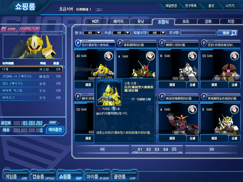 如果無法透過轉扭蛋獲得喜愛的機體,玩家可以利用合成系統取得自己想要的機體,首先玩家可以透過解合作任物、商城購買……等方式取得合成圖,再透過不同機體的組合就能合成出一台高級機體。