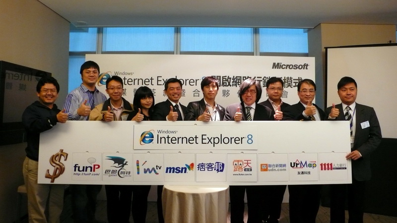 台灣微軟總經理蔡恩全與詹弘志、funP 執行長邱繼弘、巴哈姆特總監陳建弘、urMap 總經理卓政儀、I'm tv 技術長黃俊廷、台灣微軟線上服務事業群(MSN)總監黃勛秋、痞克邦創辦人暨技術長曾皇霖、1111 人力銀行副總經理兼發言人吳睿穎、聯合線上事業發展部經理莫家驊共同進行合作儀式,宣示 IE8 將於 20 日開放下載正式版,同時將舉辦集氣活動。