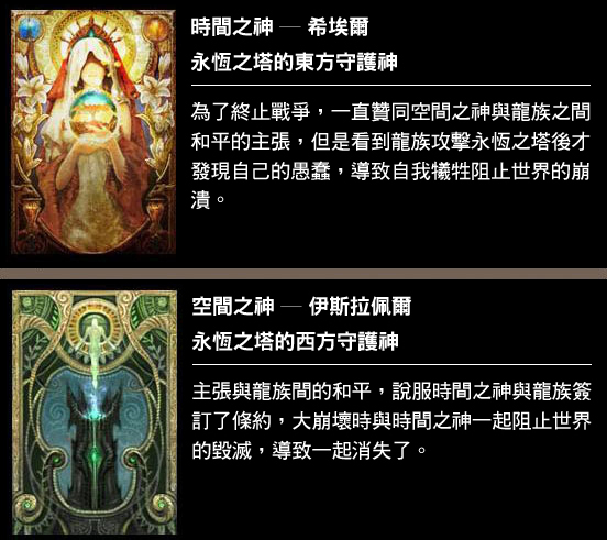 「永恆之塔」的守護者「時間之神-希埃爾」使盡最後的力氣,將分成兩部分的世界結合成一個體系,阻止「永恆之塔」繼續被破壞,並將龍族趕到體系之外。對於突如其來遭難的原因,「光明之神」與「黑暗之神」各持己見因而結怨,各自前往再也無法疏通的兩個世界。
