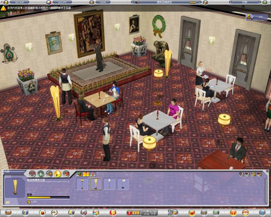 客人方面AI表現也相不錯,他們會依照接待人員所安排的位置坐下,然後打開菜單選擇要吃什麼菜,有的客人考慮時間比較久,服務生就會先送上水然後去服務別桌,但是有的客人脾氣也相當不好,稍微讓他等一下就會開始批評以及嫌東嫌西,還有大多數的客人都會在吃完飯時去上廁所,然後批評餐廳裡燈太暗菜單看不到,或是嫌哪個服務生動作粗魯、菜盤上出現小強的腳……,雖然很多理由很好笑,但是這些牢騷會降低餐廳評價,可是輕忽不得的。