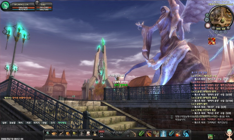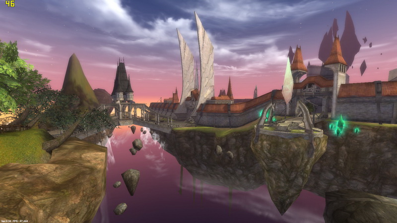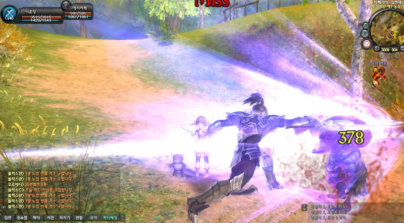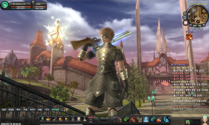 結束動畫後,玩家的視野會被帶到城鎮的出生點,感受城裡的氣氛與魄力,再慢慢轉移到角色的視角。此時玩家就可以看到一開始所創立的角色,左上方可以看到自己的血量與魔力,右上角為小地圖,可調整小地圖的大小、遠近,所在位置點以及整個地圖的視野。