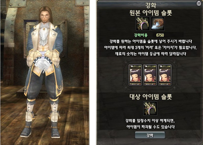 當等級八級之後,就可以開始嘗試著強化武器。遊戲中強化的方式是將強化粉和武器放到視窗中上方的空格中後點選確定,視窗中的賓果遊戲就會開始,若能成功的連線就表示強化成功,+1 到 +3 為安全值,+4 開始就有失敗的機會;而失敗的結果分為兩種,若是三個圖示都不同,武器將會消失,若是只有一個不同則會降低強化等級。等強化到一定程度之後,武器還會發出特殊的光芒喔。