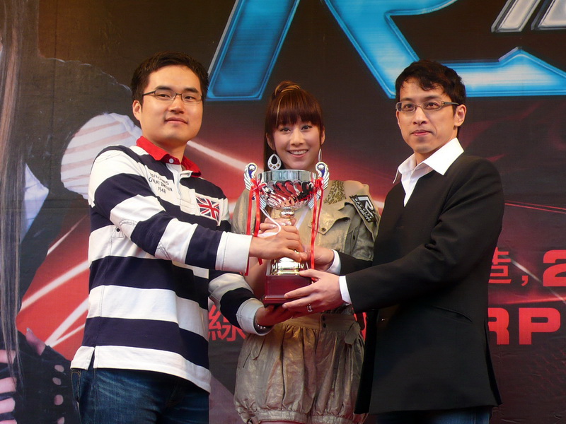 《光速城市 Ray City》今日在微風廣場舉辦上市記者會,由蔡志賢、原廠 J2M 社長方京暋與年度遊戲代言人許慧欣共同高舉冠軍杯慶祝遊戲上市。現場擺放多部名牌跑車,包括法拉利、保時捷、B