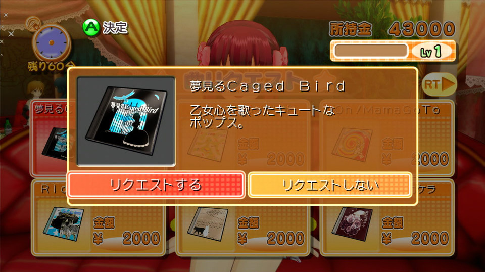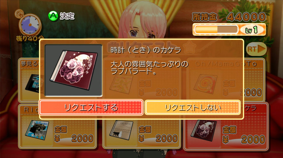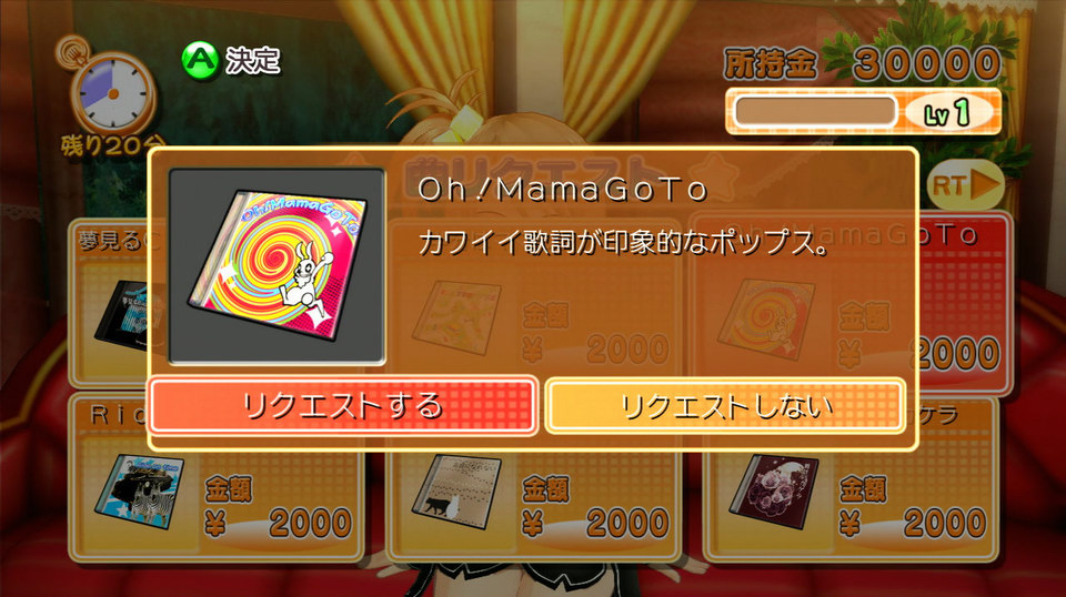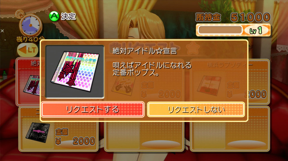 除了一起飲酒之外,還可以要求女孩登台歡唱,每個女孩都有各自拿手的歌曲,要求被接受的話就可以欣賞到動感俏麗的舞台表演,不過親密度不夠時可能會遭到拒絕。