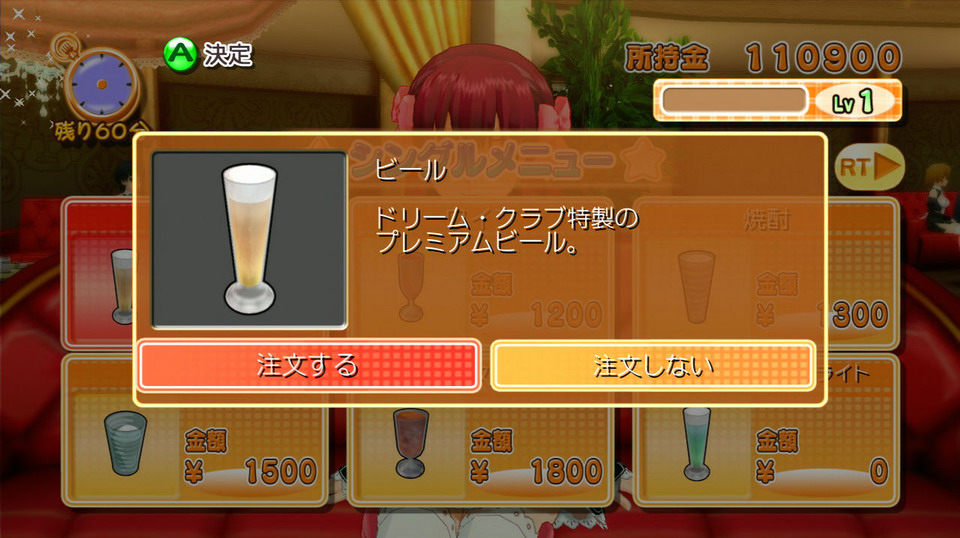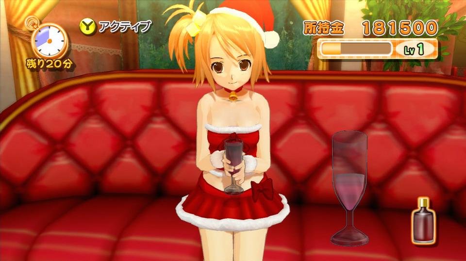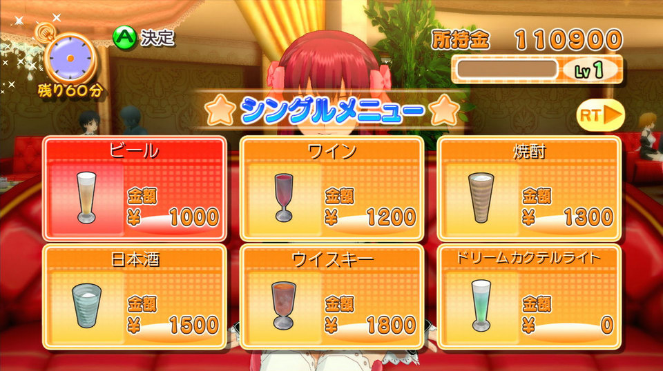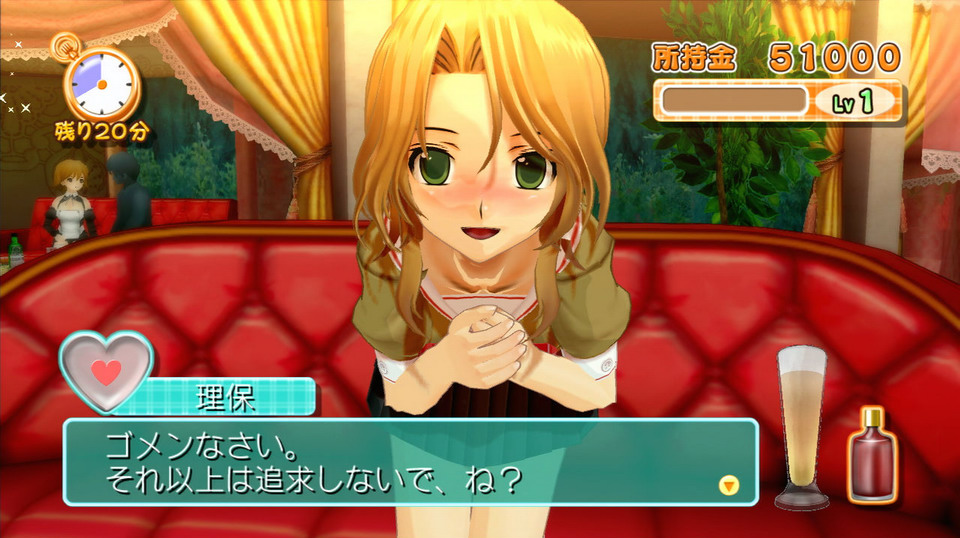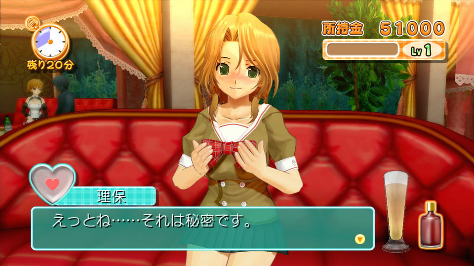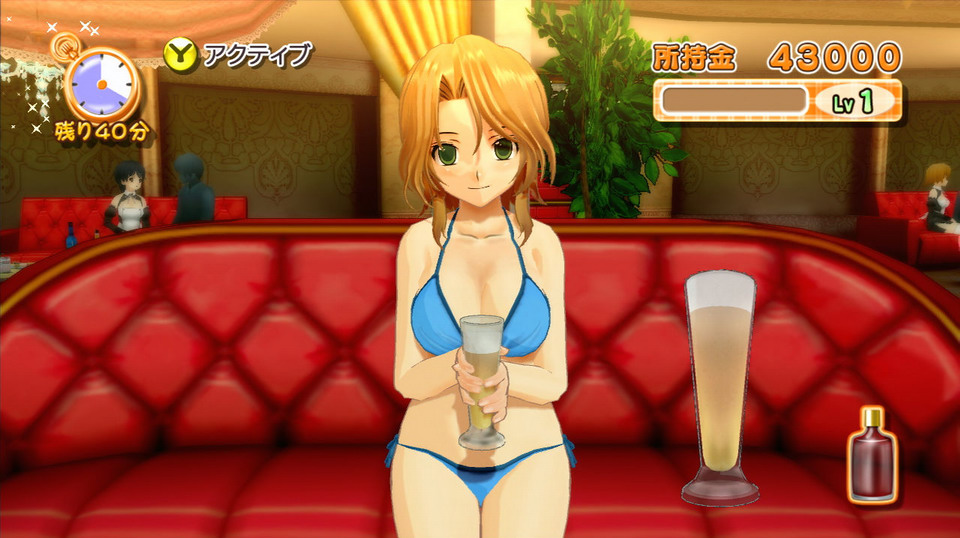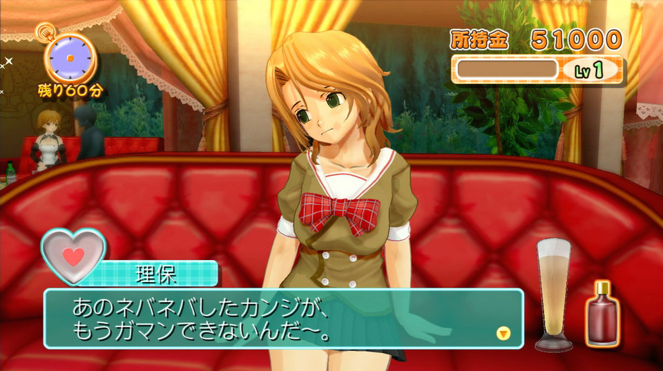 不同的接待女侍有著各自喜好的酒類,碰到喜歡的酒類時飲酒量也會隨之增加。當雙方進入酒酣耳熱的微醺階段時,女孩的反應跟對話都會產生變化,有機會能聽到女孩酒後吐真言。因此保持自己不醉倒並盡量逗女孩喝酒的技巧,將是遊戲攻略的重點。