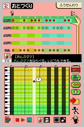 在主要遊玩模式「本大爺家」中,玩家可利用「遊戲創作工具」來製作小遊戲,其中包括透過觸控筆來繪製角色與背景的「繪圖」編輯器,透過編輯簡譜來製作配樂的「製作聲音」編輯器,以及組合圖像與聲音元素並設定遊戲規則的「組裝」編輯器。