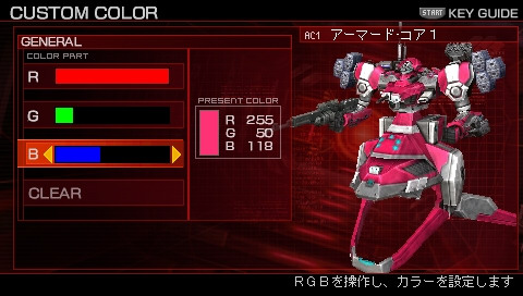 遊戲採用受系列玩家好評、兼具設計性與操作性的《機戰傭兵:前線方程式》選單界面,讓玩家自由選擇零件,設定機體配色繪製徽章圖案,享受順暢的機甲組裝樂趣。