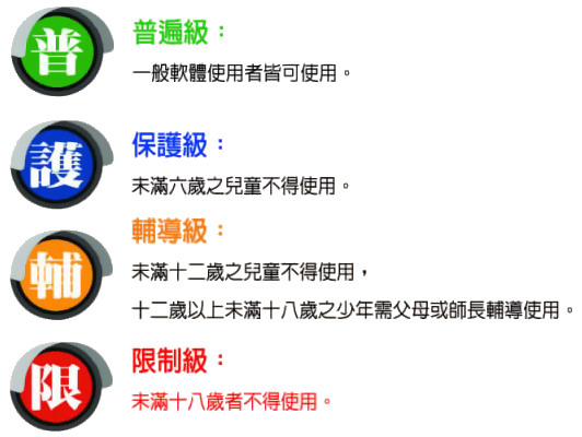電影片分級處理辦法,將遊戲分為與電影相同的 4 級,也就是大家所熟悉的普遍級、保護級、輔導級與限制級:
