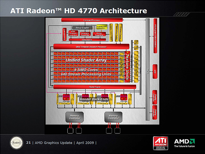 Radeon HD 4770 是承襲 Radeon HD 4000 系列架構的效能級繪圖卡產品,首度導入 TSMC 最先進的 40 奈米製程來縮小晶片尺寸、降低耗電量與提昇運作時脈與,並結合高時脈 GDDR5 繪圖記憶體,具備優異的性價比。