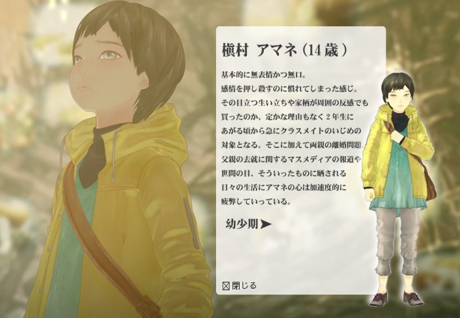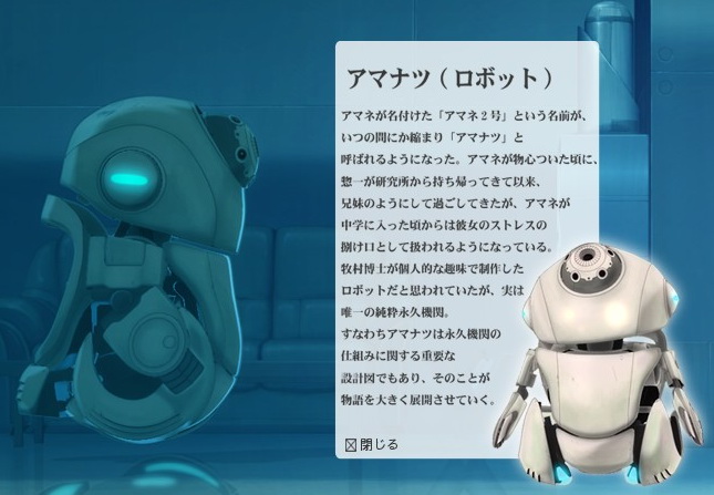 》中,父母的離婚、加上不斷受到同學的欺負,否定了自己的存在的女主角為了前往「世界的終點」而離家,而唯一能夠對於她的存在加以肯定的,就是從小陪伴她成長的機器人。故事便以「每天都想著死亡」的少女「AMANE(アマネ)」,與「永遠不會停擺」的機器人「