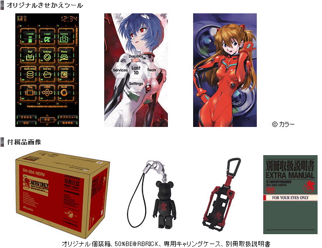 而「SH-06A NERV」手機本身是設定為作品中主角所屬的特別機關「拿夫(NERV)」官方配給的配備,該商品從手機機身、附加週邊到包裝,皆是由《福音戰士》的總監督 庵野秀明以及動畫製作公司 Studio Color 全程監製。手機內的檔案也包含了為作品進行人物設定的 貞本義行所繪製的待機畫面,還有聲優特別錄製的來電鈴聲等。