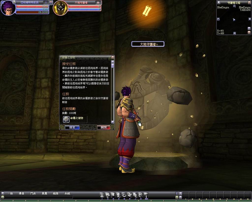 司馬上人會請玩家先去守護者之塔見元素守護者(每個職業代表的元素不同),塔內的元素守護者會要求玩家前往混沌結界找回象徵命運的信物。「混沌結界」任務其實只是要試探玩家所扮演的英雄是否夠資格擔任尋找九寶的重責大任,所以在混沌結界內會有看起來很可怕的魔物看守。